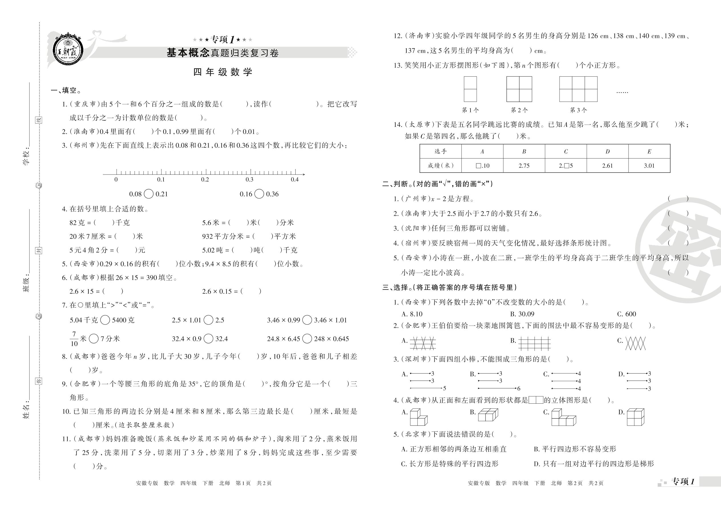 王朝霞期末专项卷——基本概念、计算真题归类复习四年级下册数学(北师版)【0】