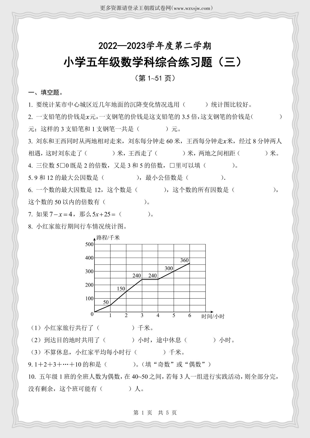 海南省海口市2022-2023学年度第二学期期中综合练习题五年级数学(苏教版)