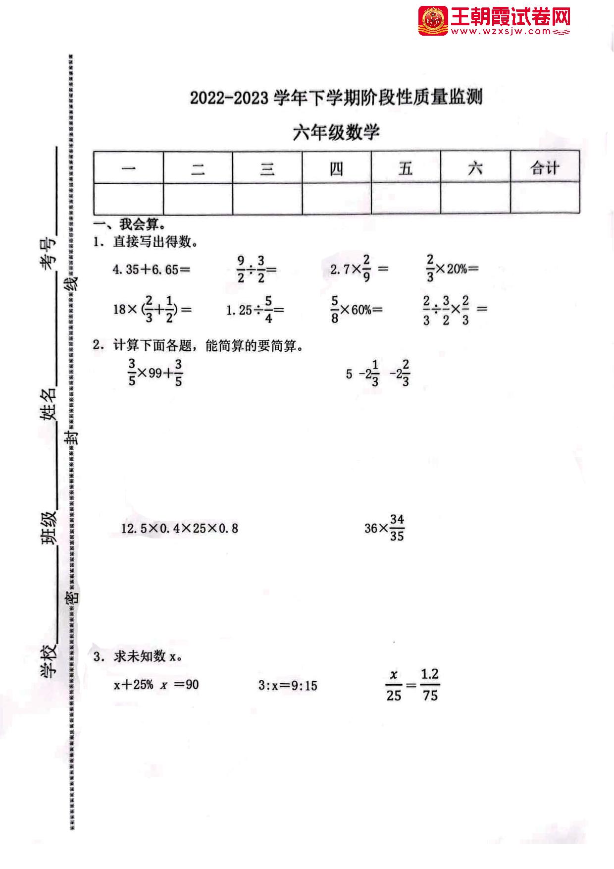 山东省临沂市平邑县2022-2023学年下学期(期中)阶段性质量监测六年级数学(人教版)