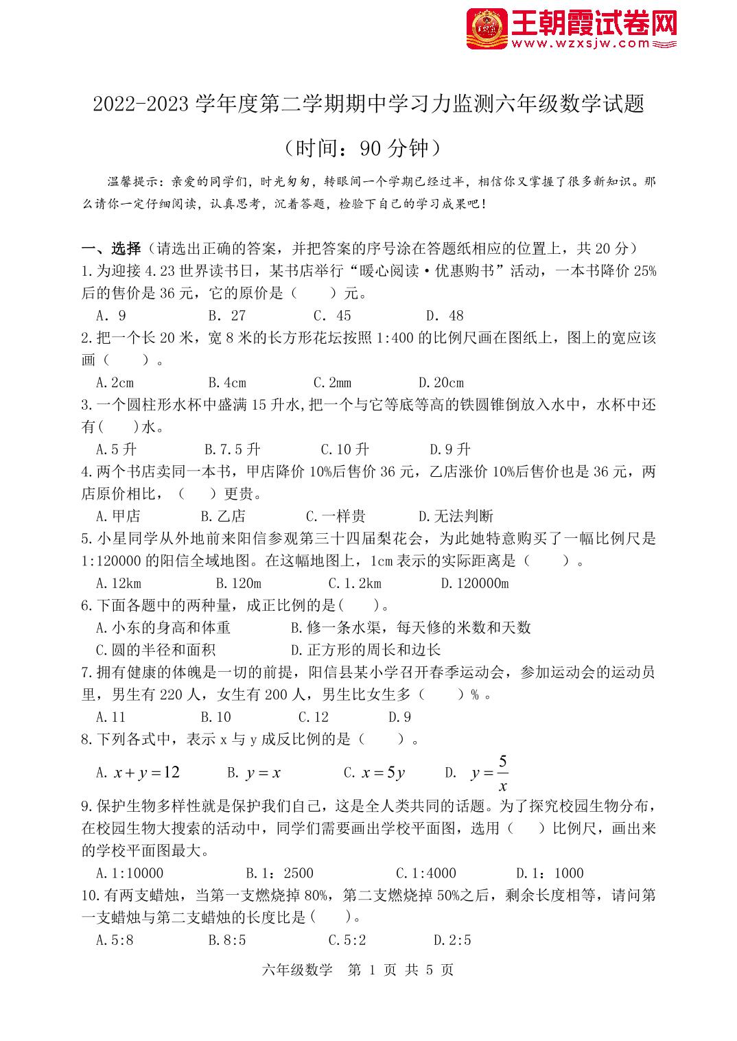 六年级数学青岛版下册期中卷