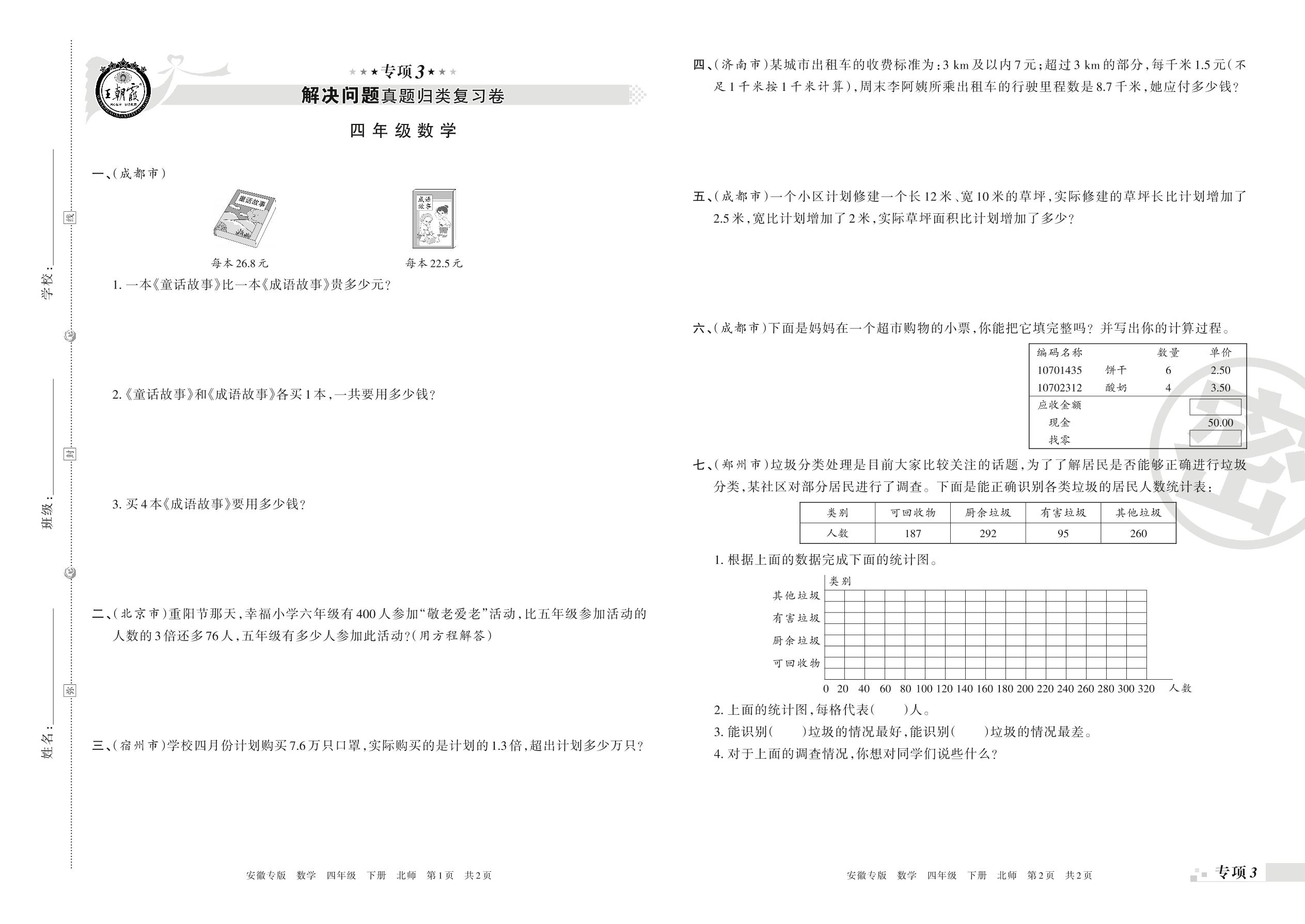 王朝霞期末专项卷——解决问题真题归类复习、新颖题速递:生活与数学四年级下册数学(北师版)【0】