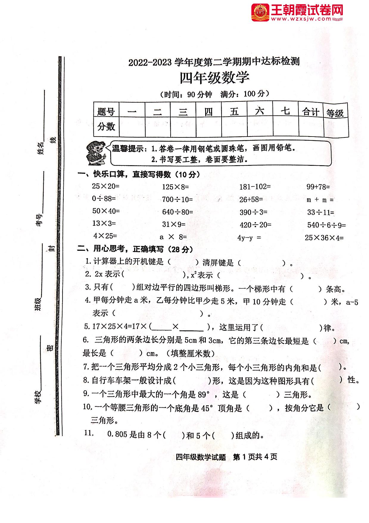 山东省枣庄市市中区2022-2023学年度第二学期期中达标检测四年级数学(青岛版)