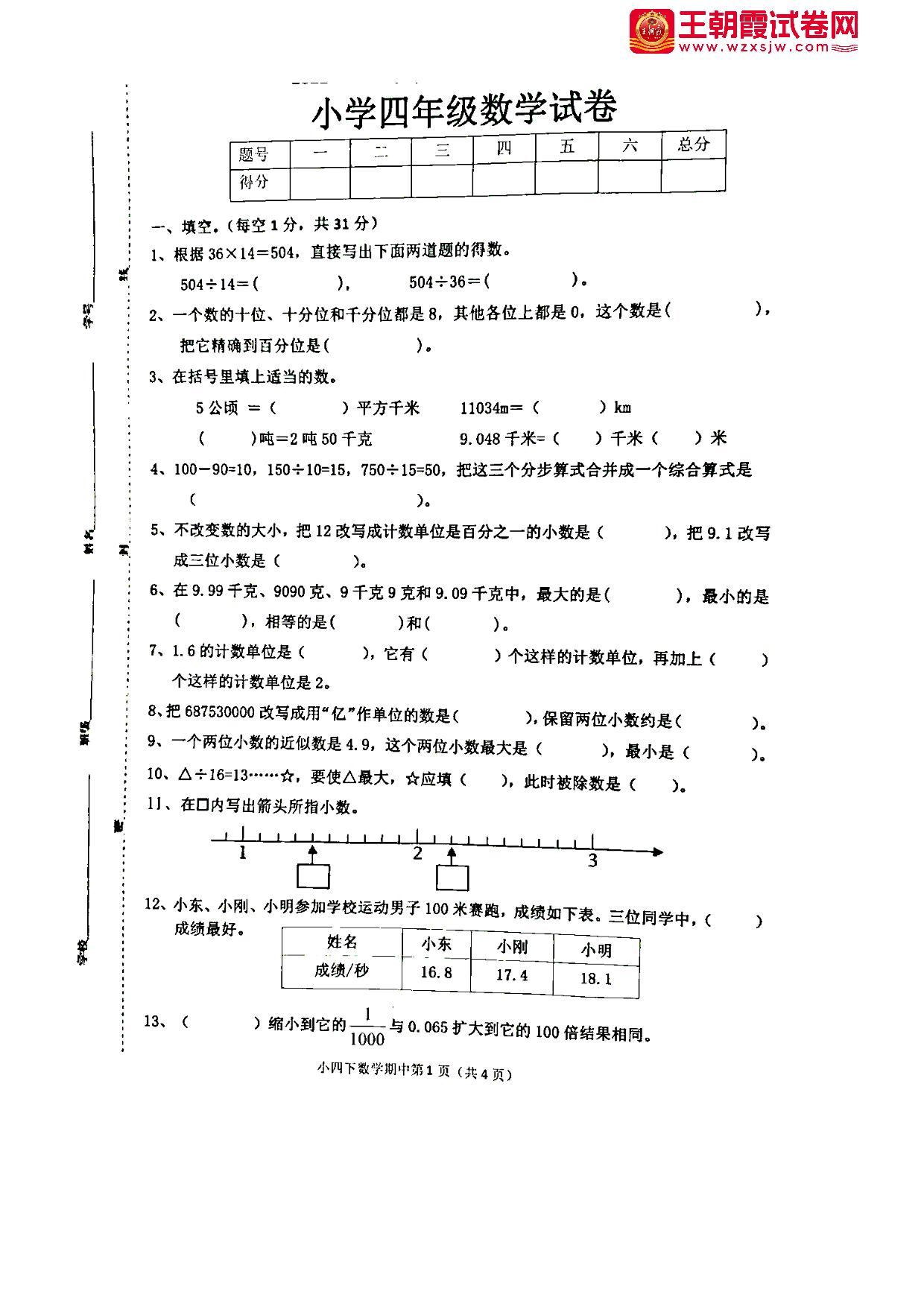 山东省菏泽市单县2022-2023年下学期期中试题四年级数学(人教版)