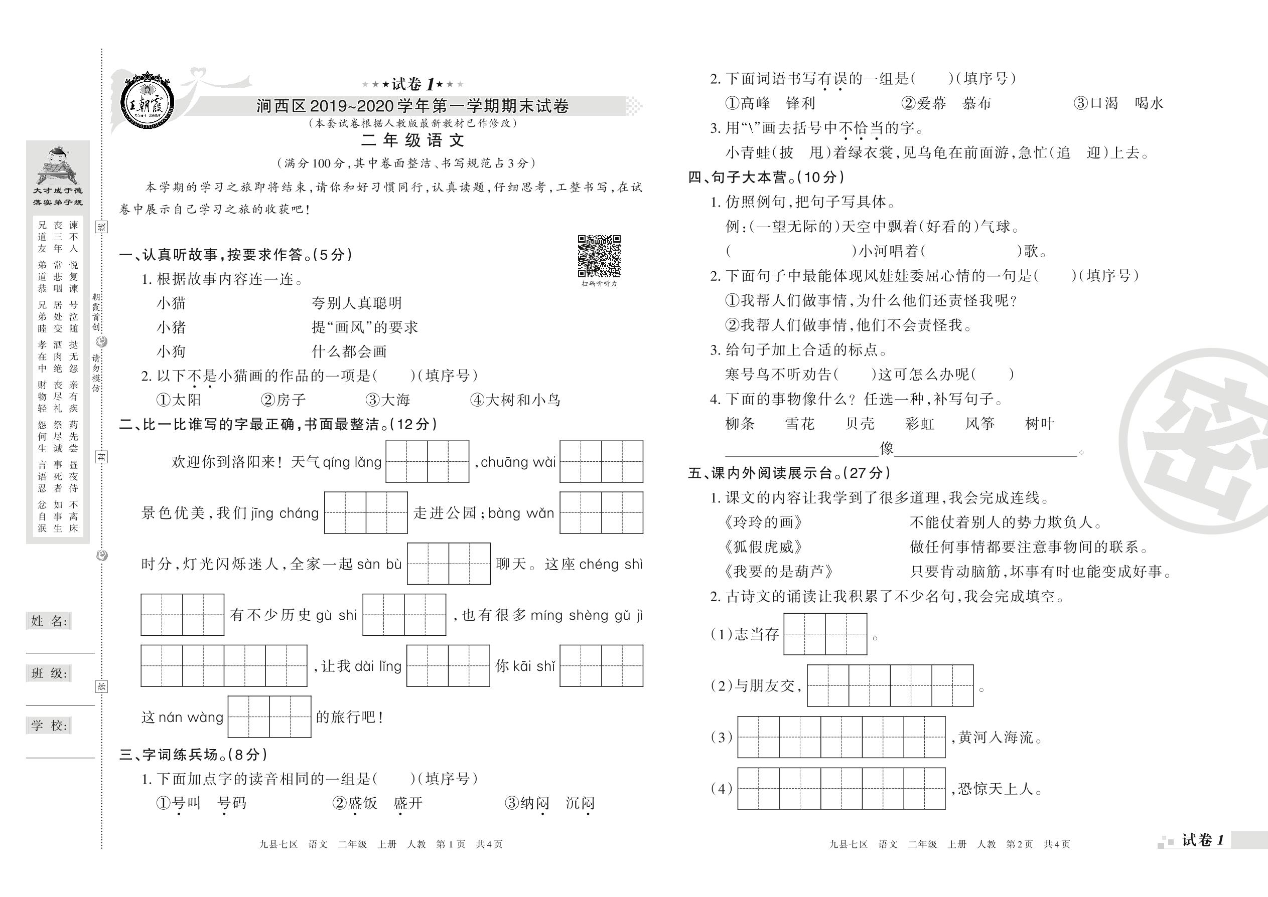 2019-2020学年第一学期洛阳市涧西区二年级语文试卷(人教版)【1】