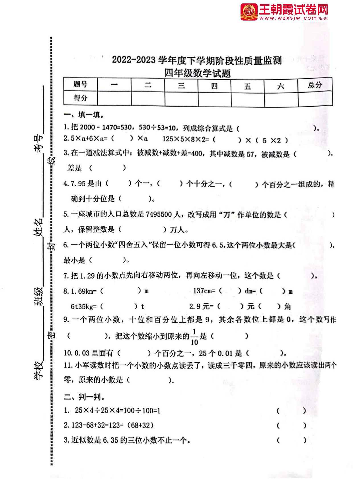 山东省临沂市平邑县2022-2023学年度下学期(期中)阶段性质量监测四年级数学(人教版)