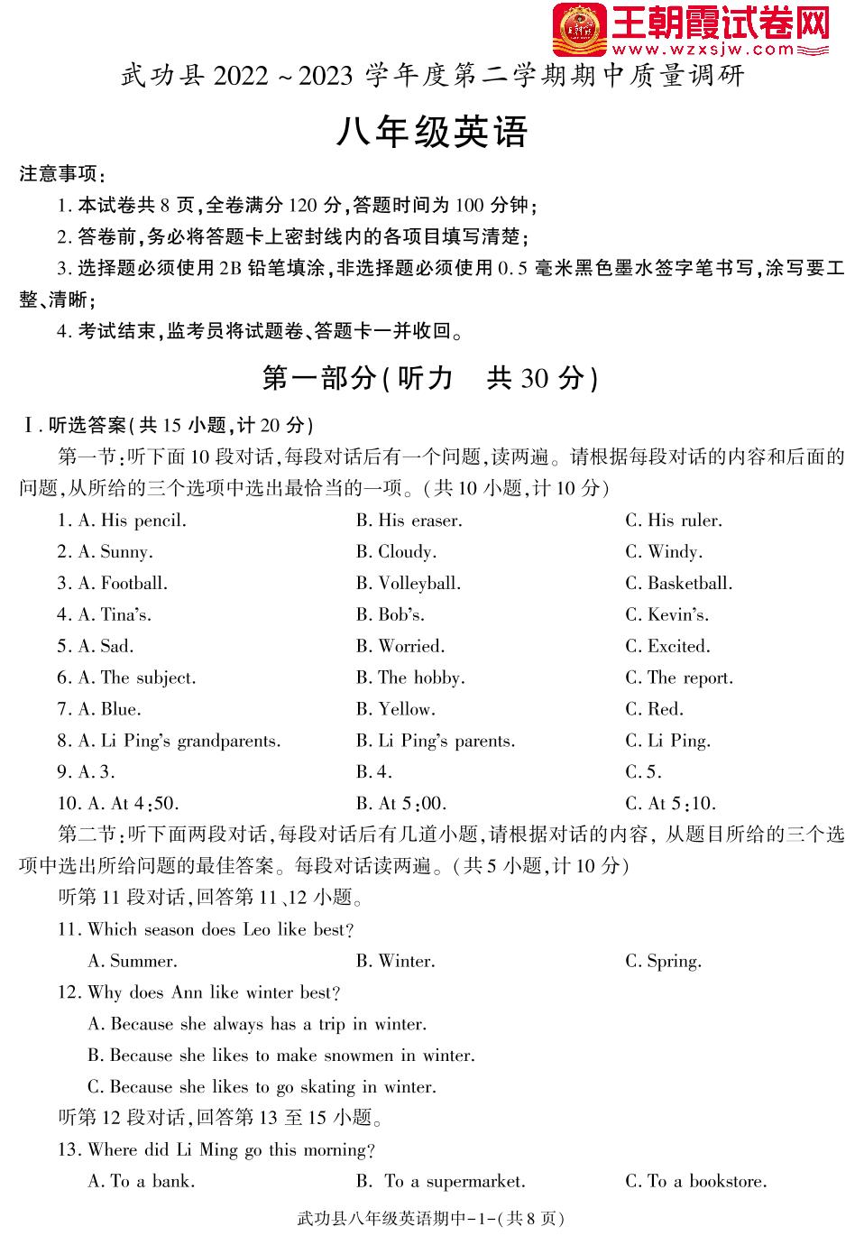 陕西省咸阳市武功县2022-2023学年度第二学期期中质量调研八年级英语(人教版)【无听力音频】