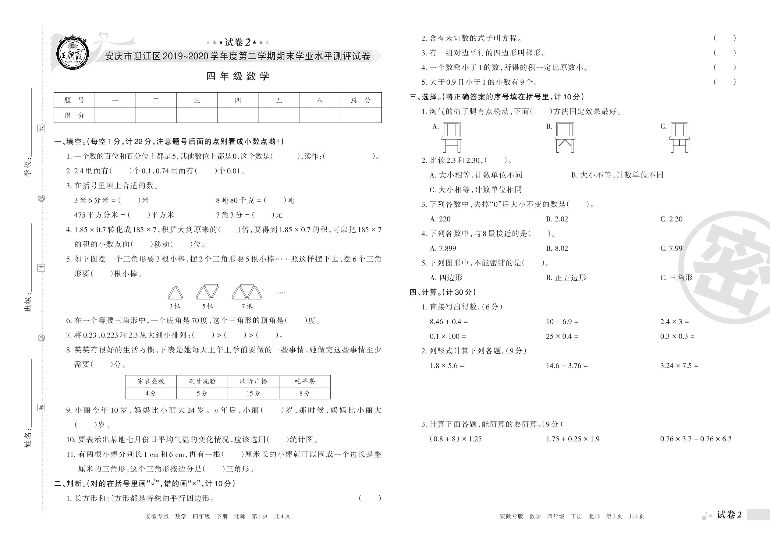 2019-2020学年第二学期安庆市迎江区四年级数学试卷(北师版)【2】