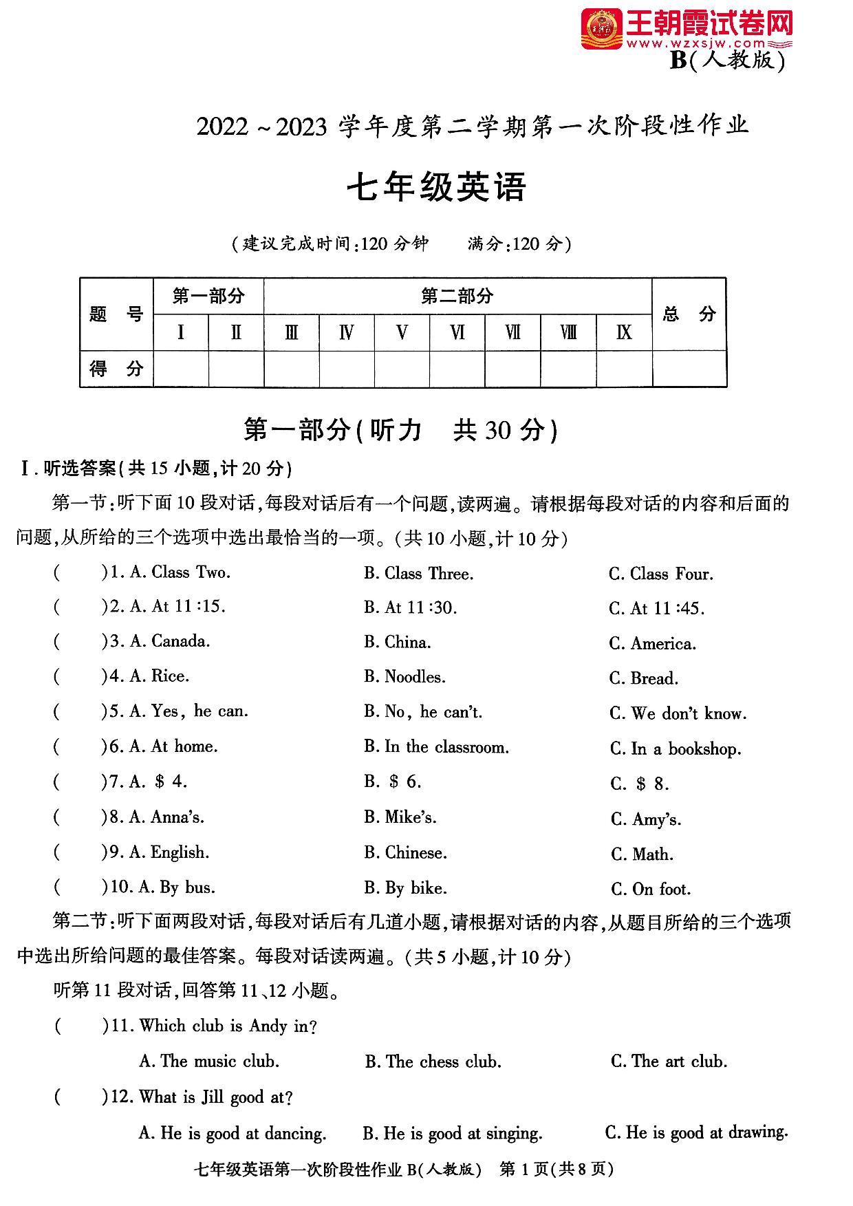 陕西省咸阳市秦都中学2022-2023学年度第二学期第一次阶段性作业(月考)七年级英语(人教版)【无听力音频】