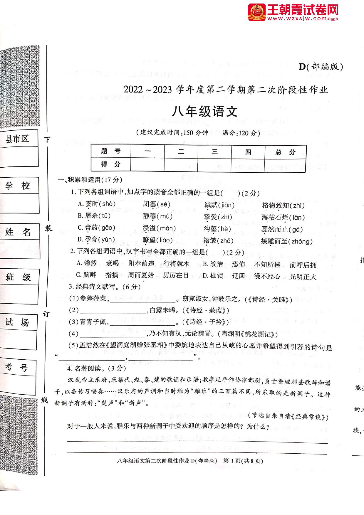 陕西省延安市志丹县2022-2023学年度第二学期第二次阶段性作业(月考)八年级语文(人教版)