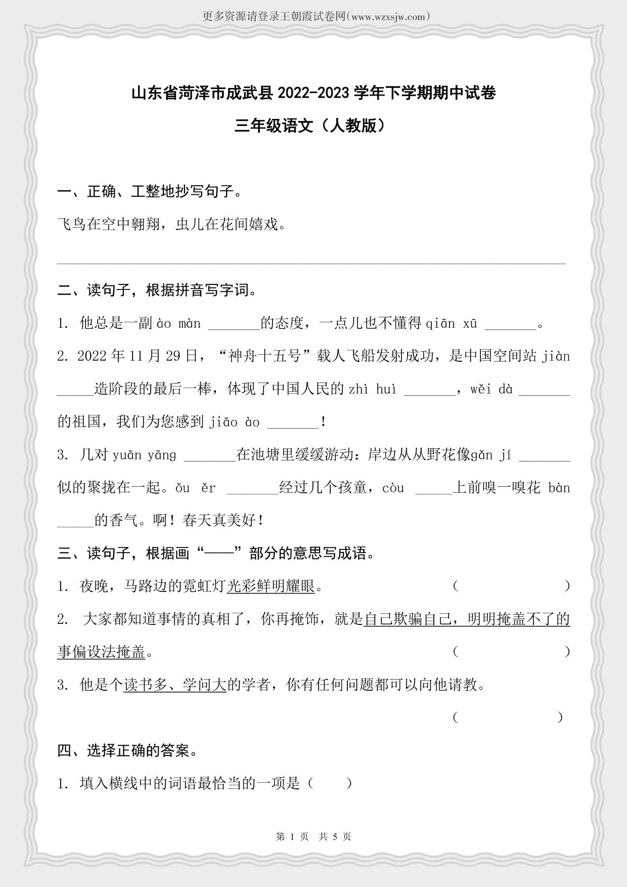 山东省菏泽市成武县2022-2023学年下学期期中试卷三年级语文(人教版)