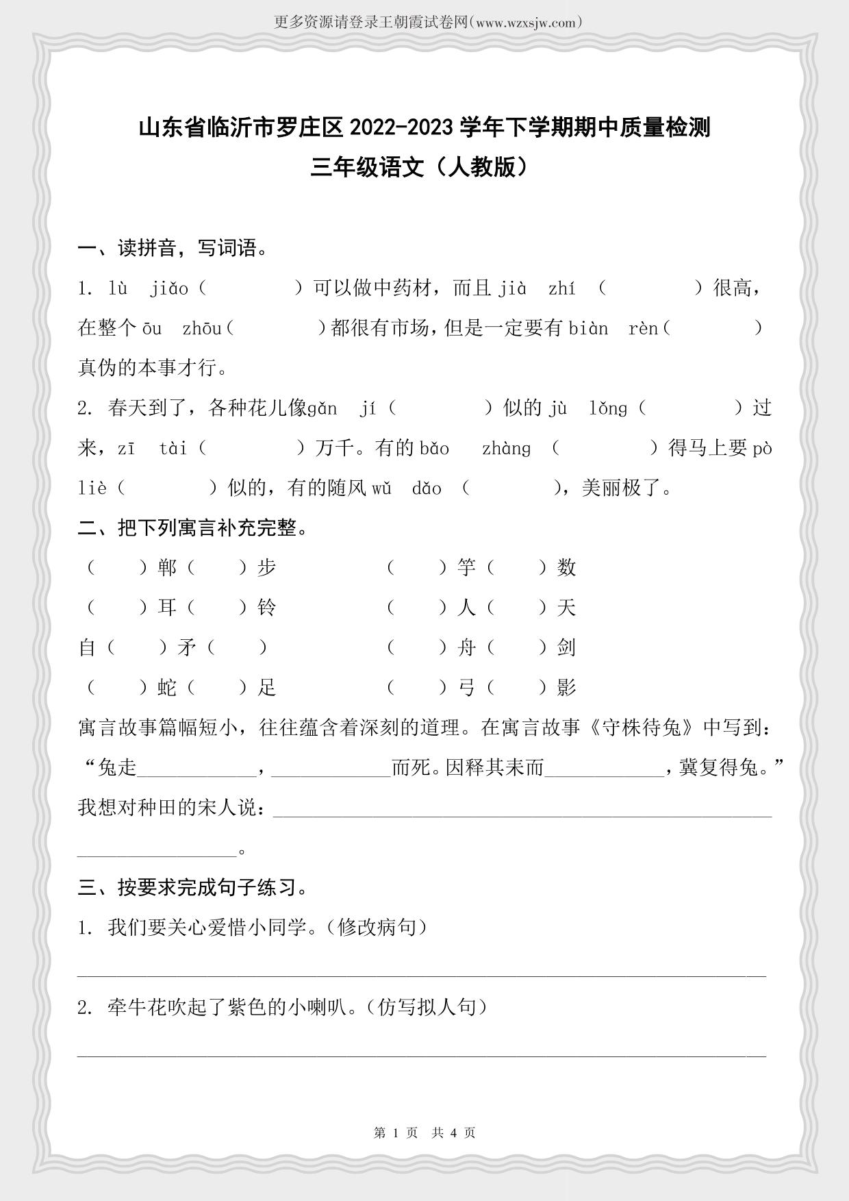 山东省临沂市罗庄区2022-2023学年下学期期中质量检测三年级语文(人教版)