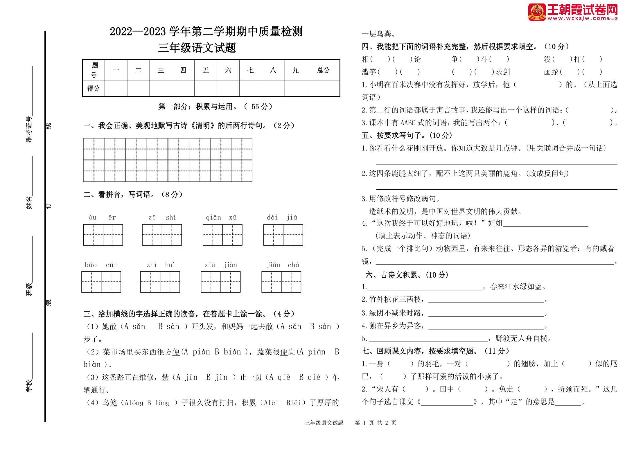 三年级语文人教版下册期中卷