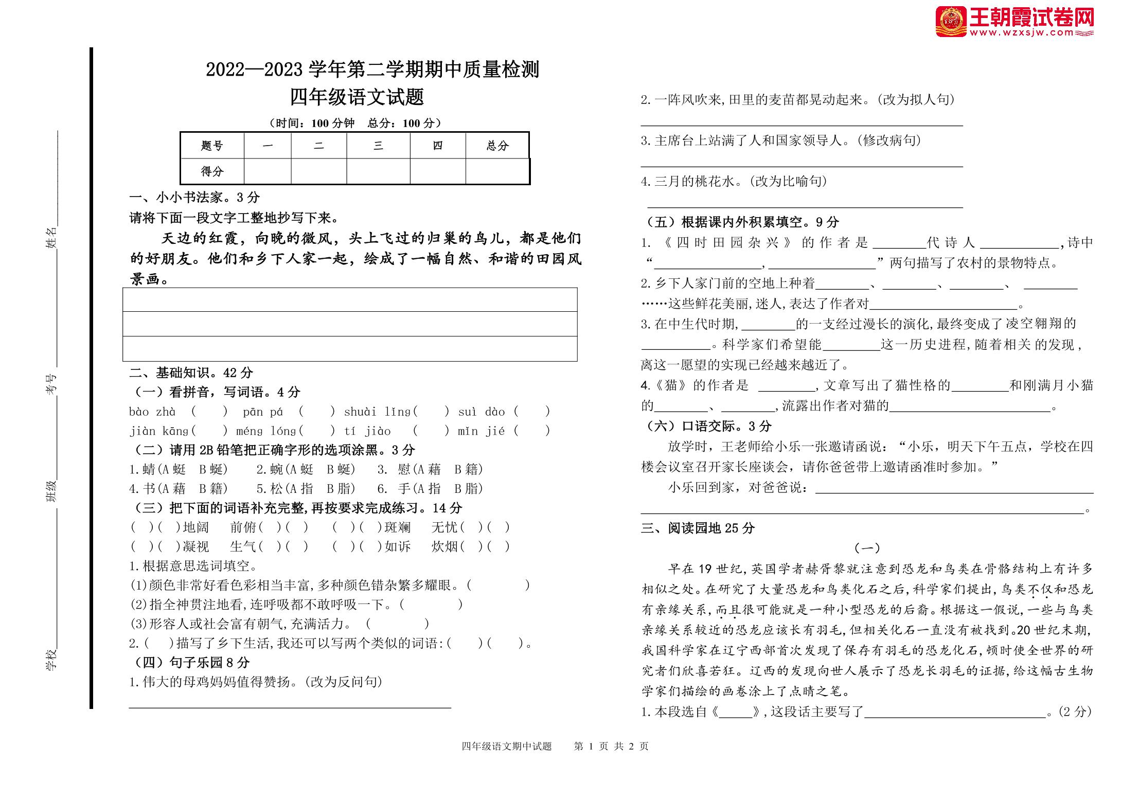 山东省德州市夏津县2022-2023学年度第二学期期中质量检测四年级语文(人教版)