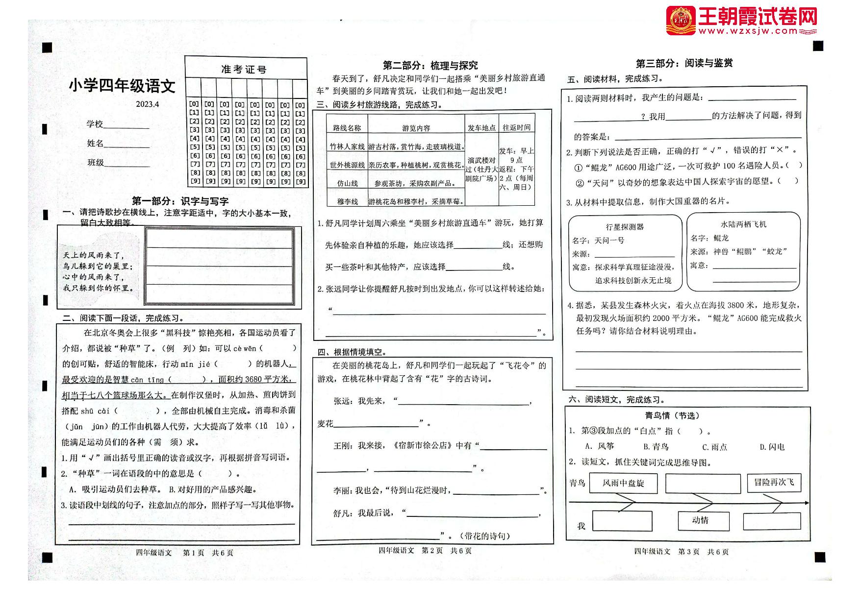 山东省菏泽市牡丹区2022-2023学年下学期4月期中考试四年级语文(人教版)