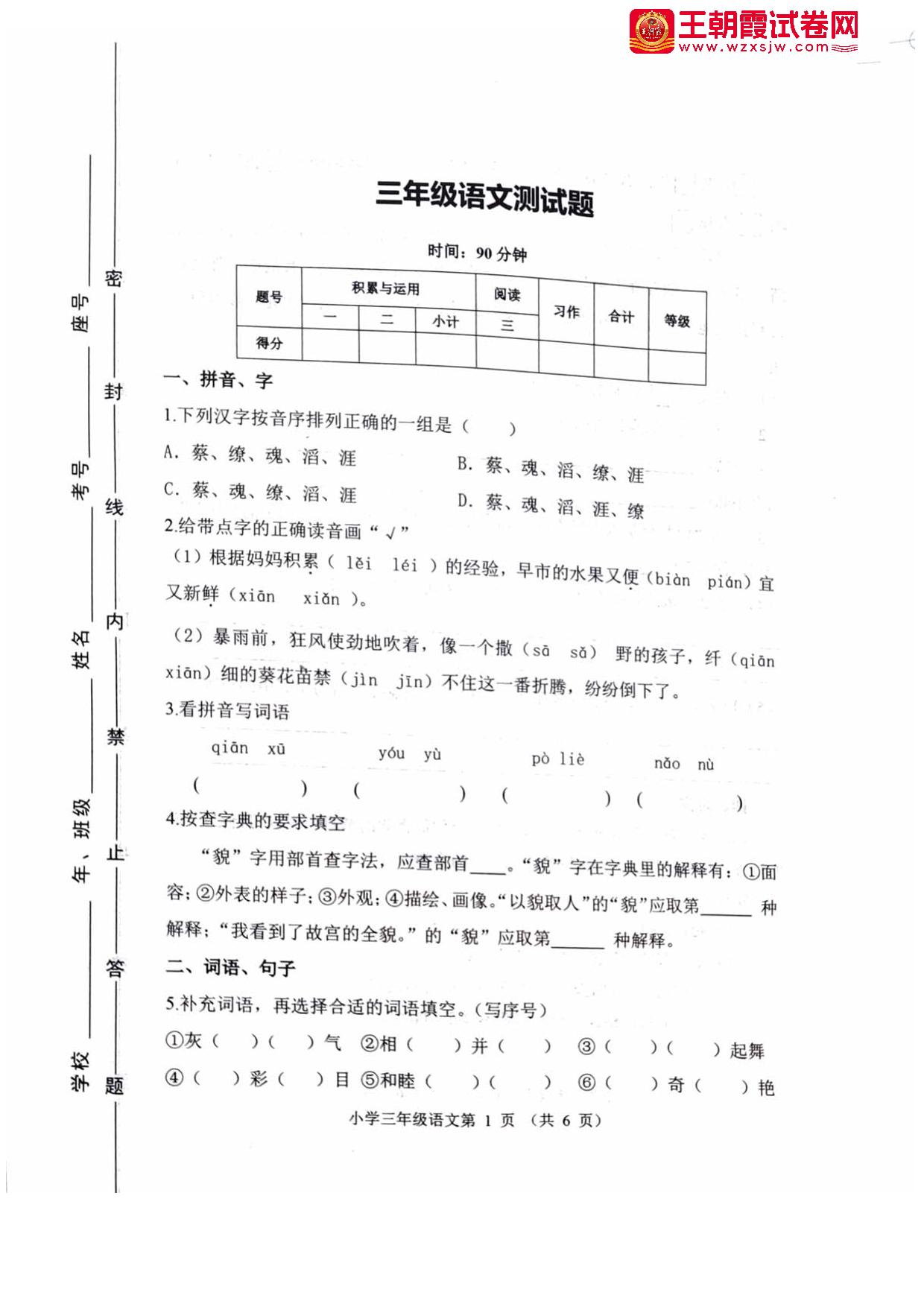 山东省威海市乳山市2022-2023学年下学期期中测试题三年级语文(人教版)
