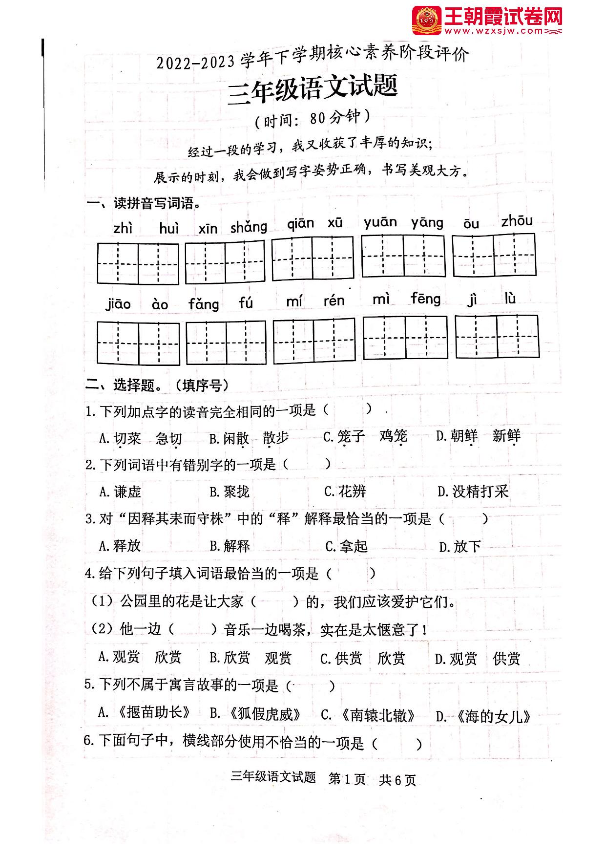 山东省日照市东港区2022-2023学年下学期期中核心素养阶段评价三年级语文(人教版)