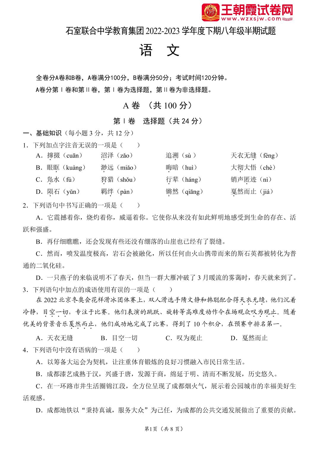 四川省成都市石室联合中学教育集团2022-2023学年度下学期期中测试八年级语文(人教版)