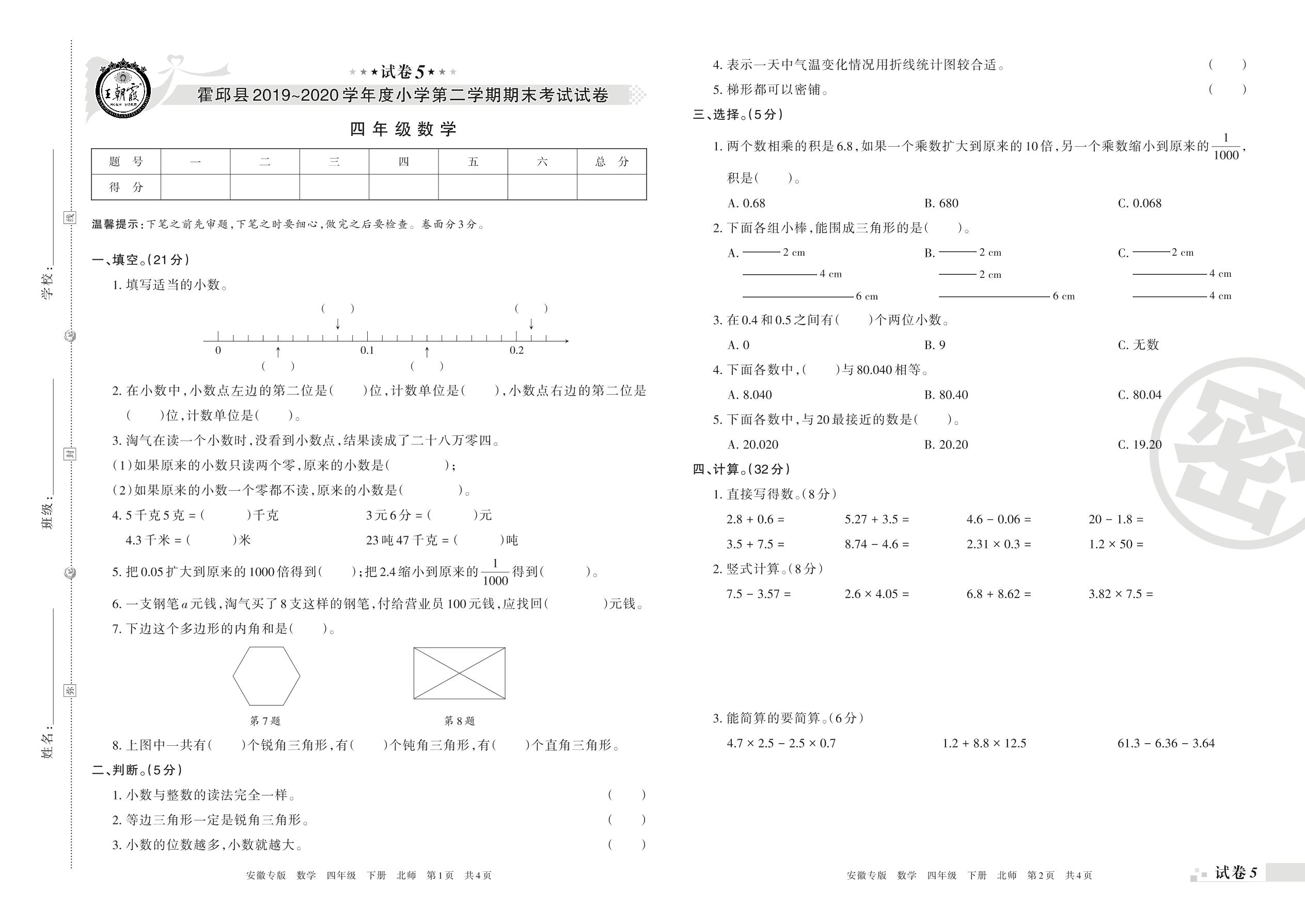 2019-2020学年第二学期六安市霍邱县四年级数学试卷(北师版)【5】