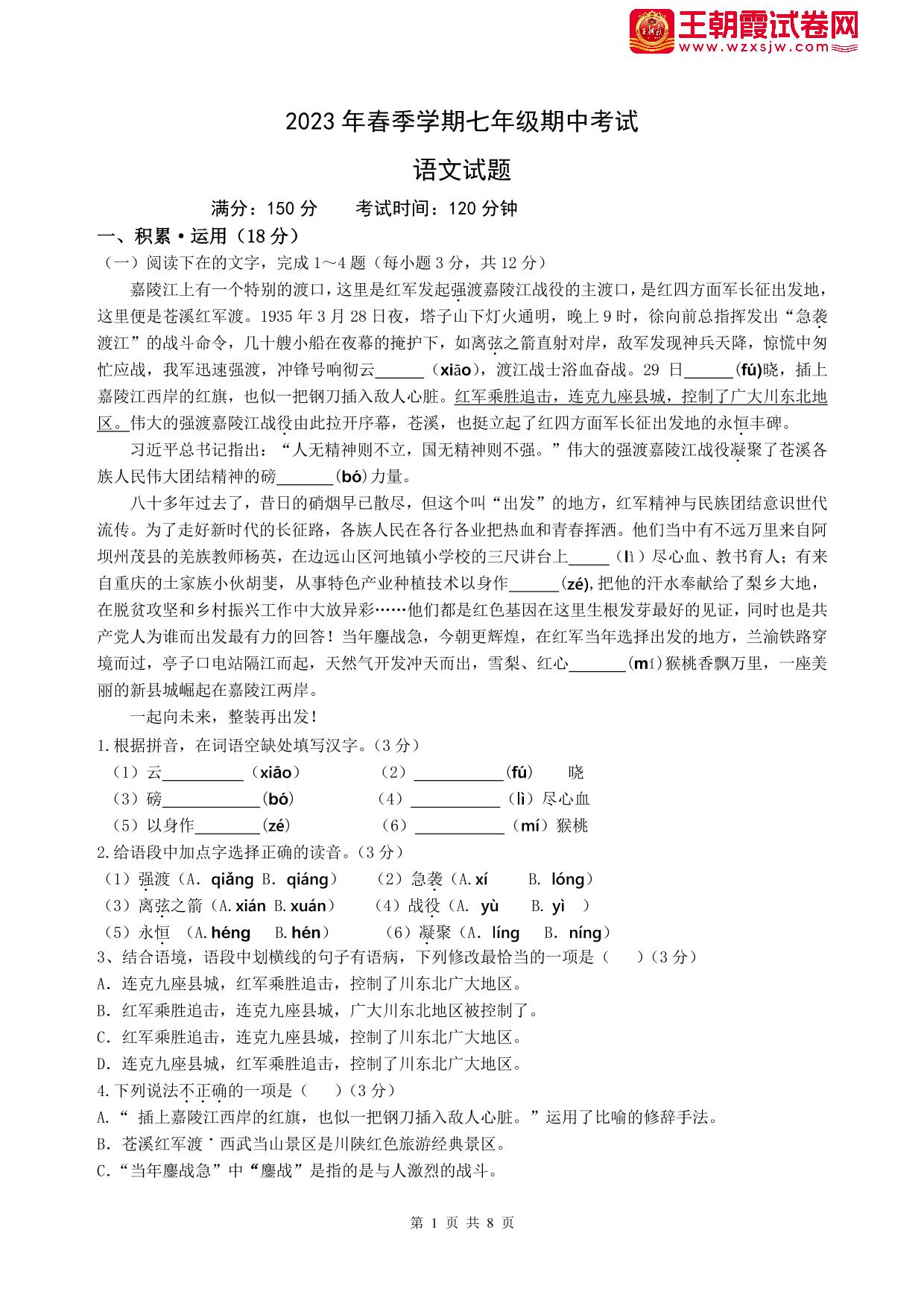 四川省广元市苍溪县2022-2023学年下学期期中考试七年级语文(人教版)