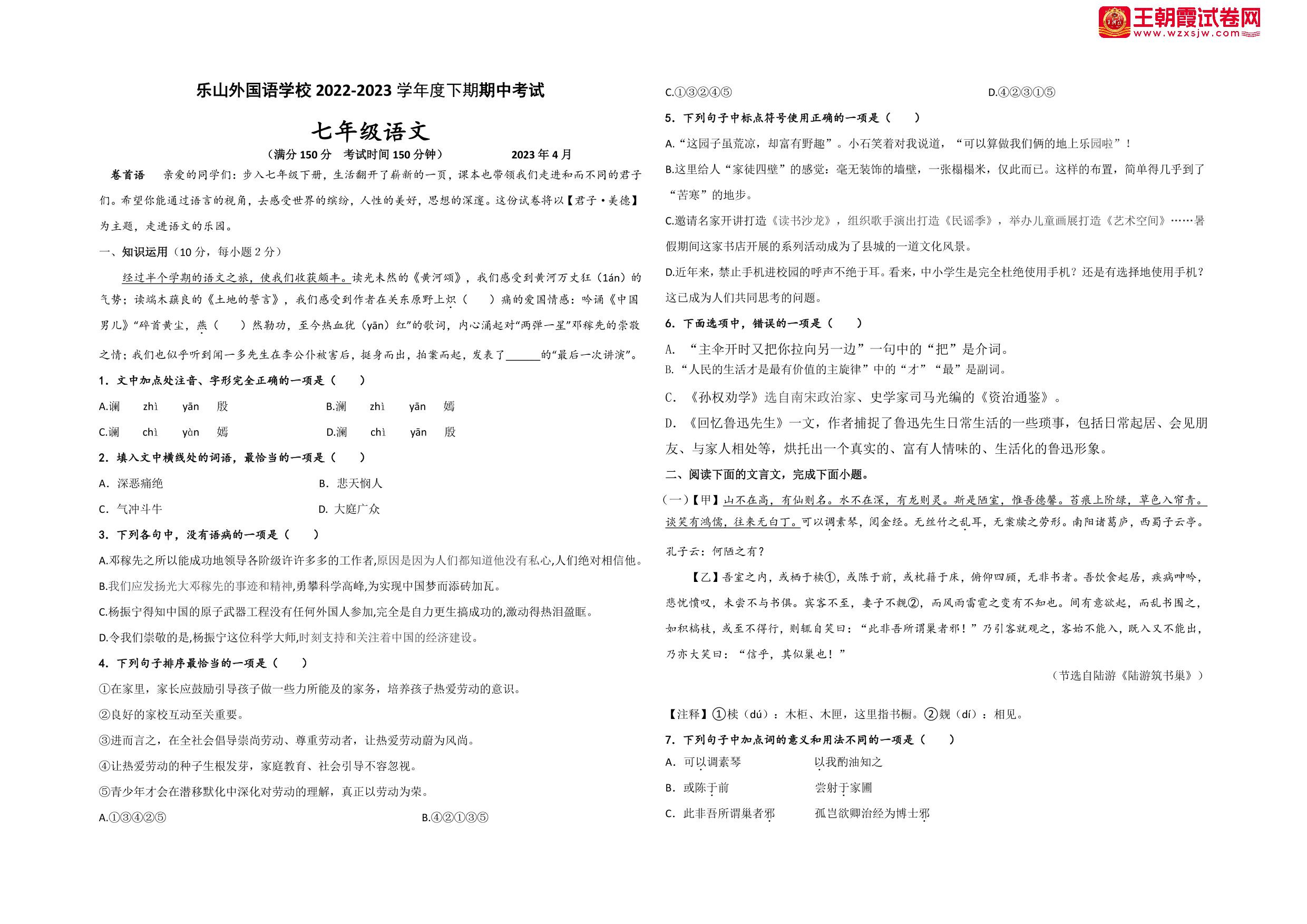 四川省乐山市外国语学校2022-2023学年度下学期期中考试七年级语文(人教版)