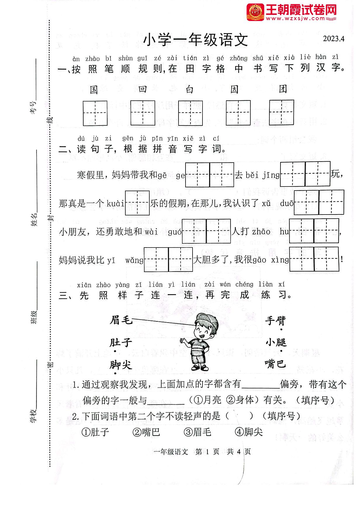 山东省菏泽市牡丹区2022-2023学年下学期4月期中考试一年级语文(人教版)