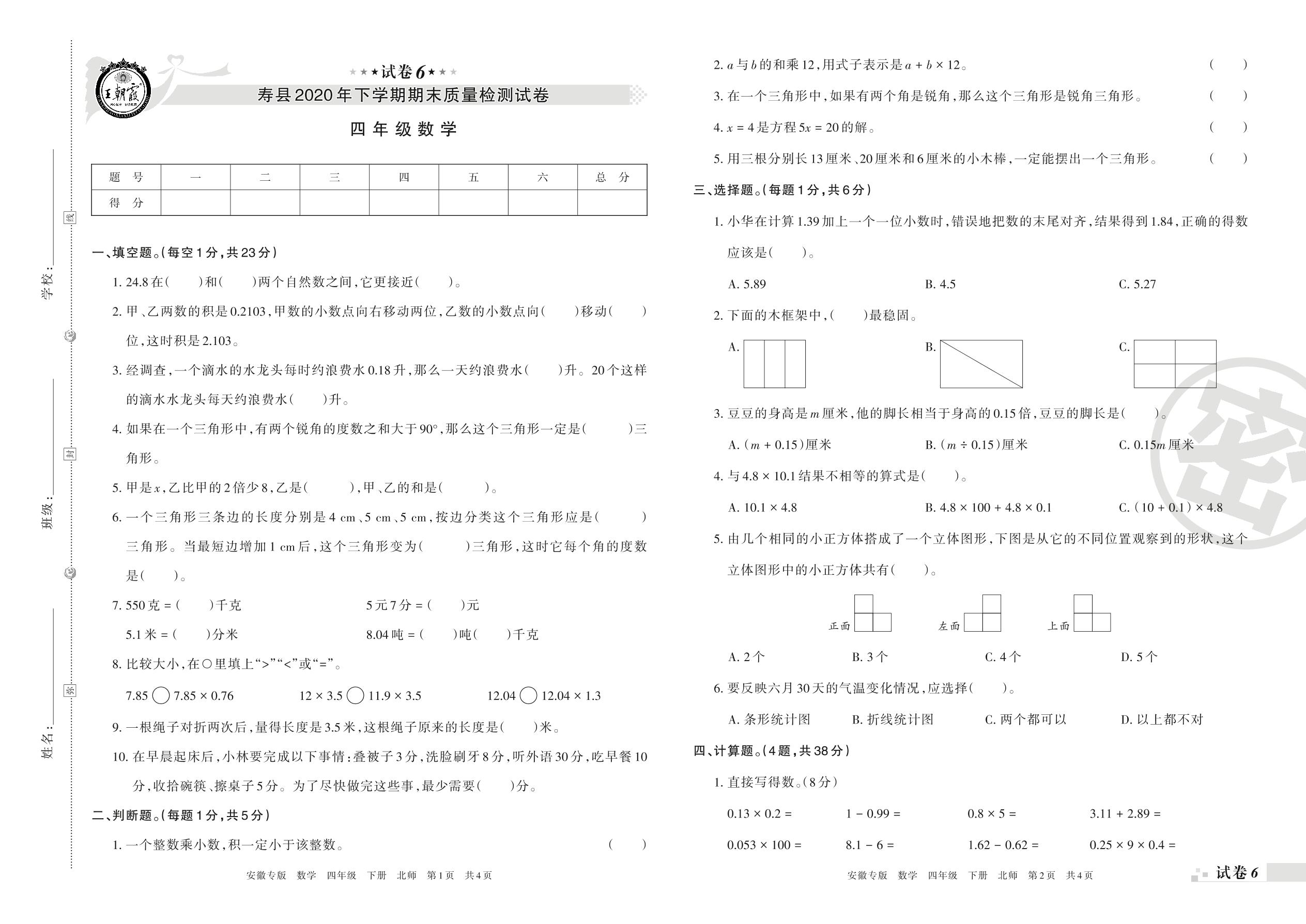 2019-2020学年第二学期淮南市寿县四年级数学试卷(北师版)【6】