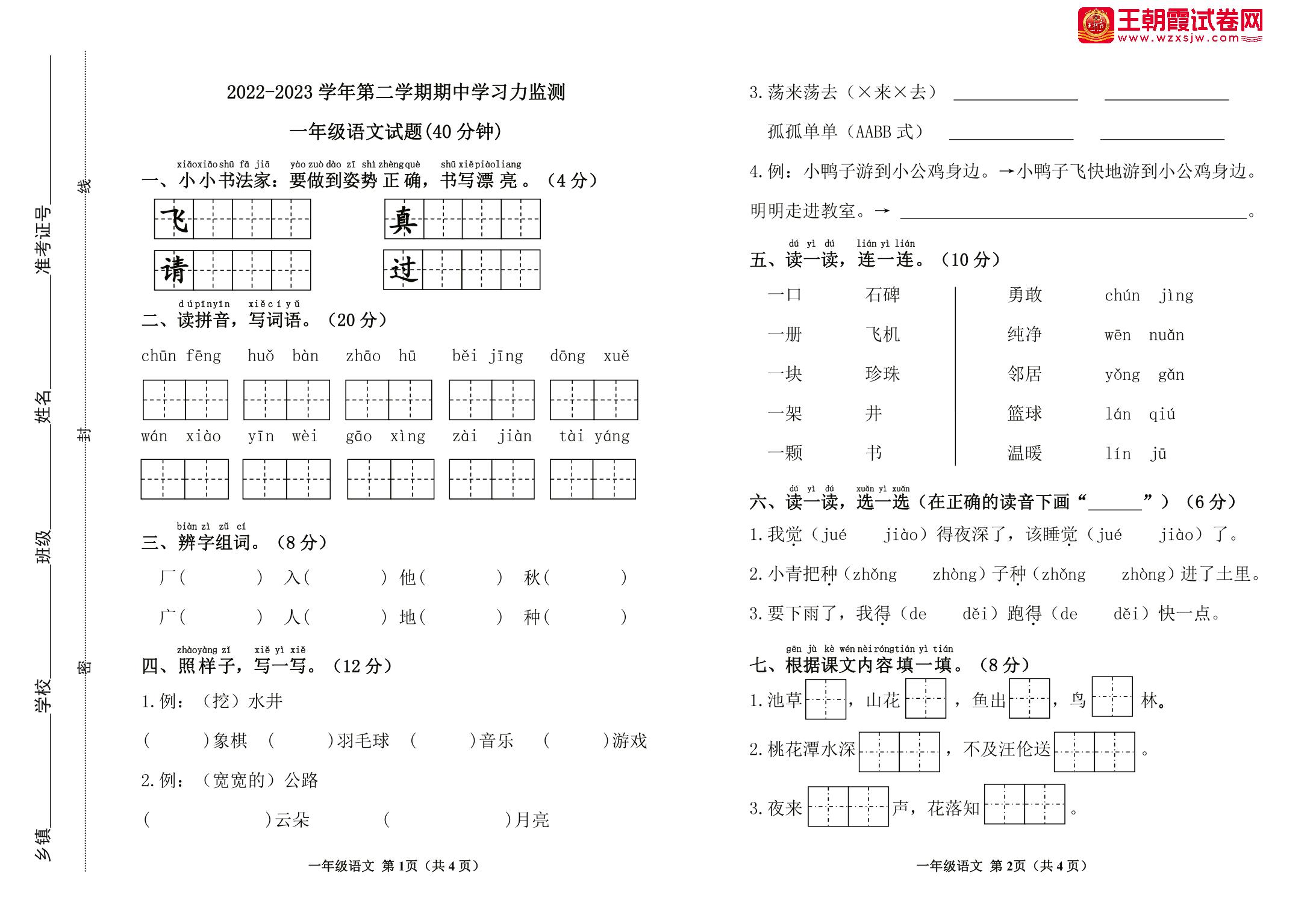 山东省滨州市阳信县2022-2023学年第二学期期中学习力监测一年级语文(人教版)