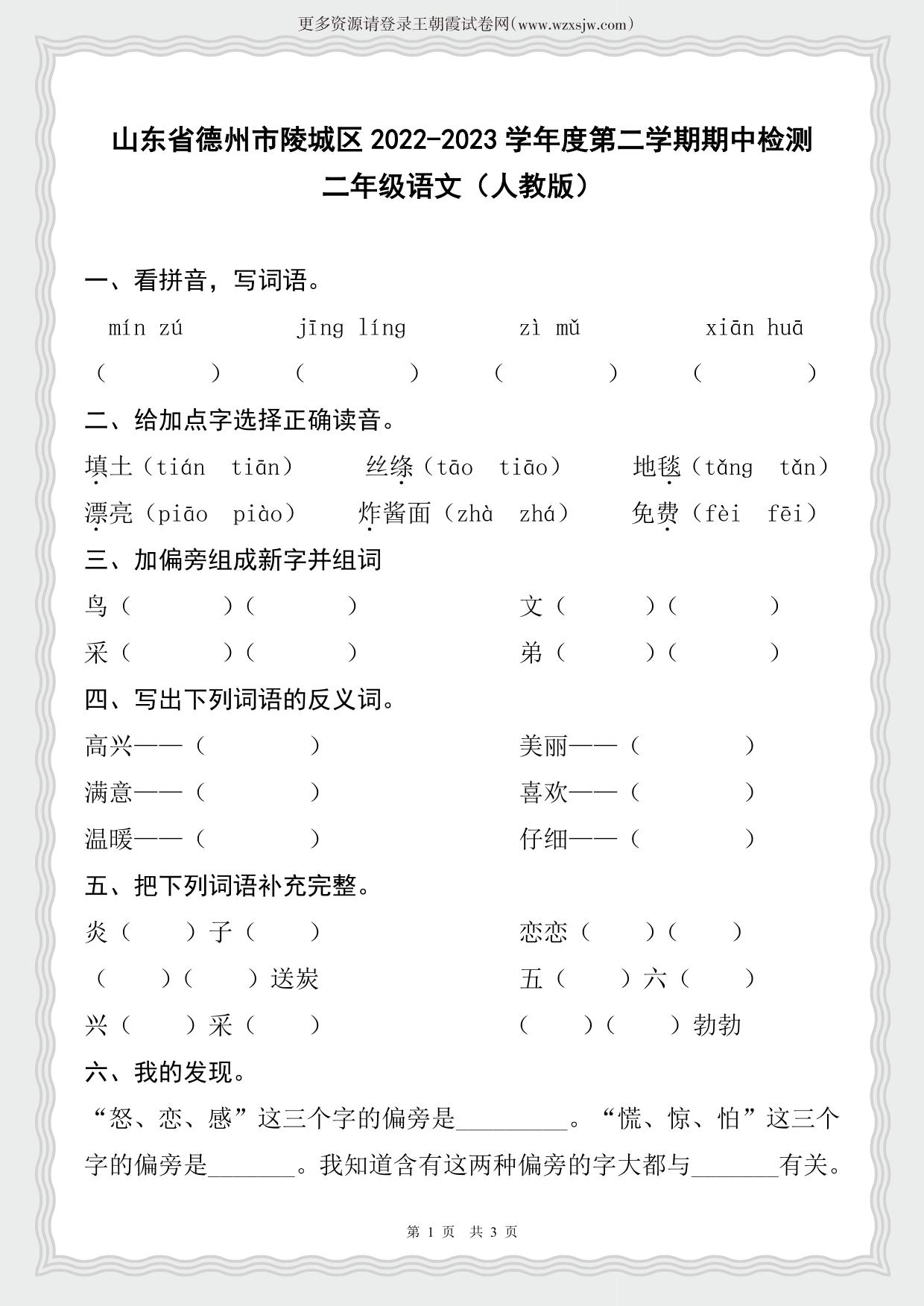 山东省德州市陵城区2022-2023学年度第二学期期中检测二年级语文(人教版)