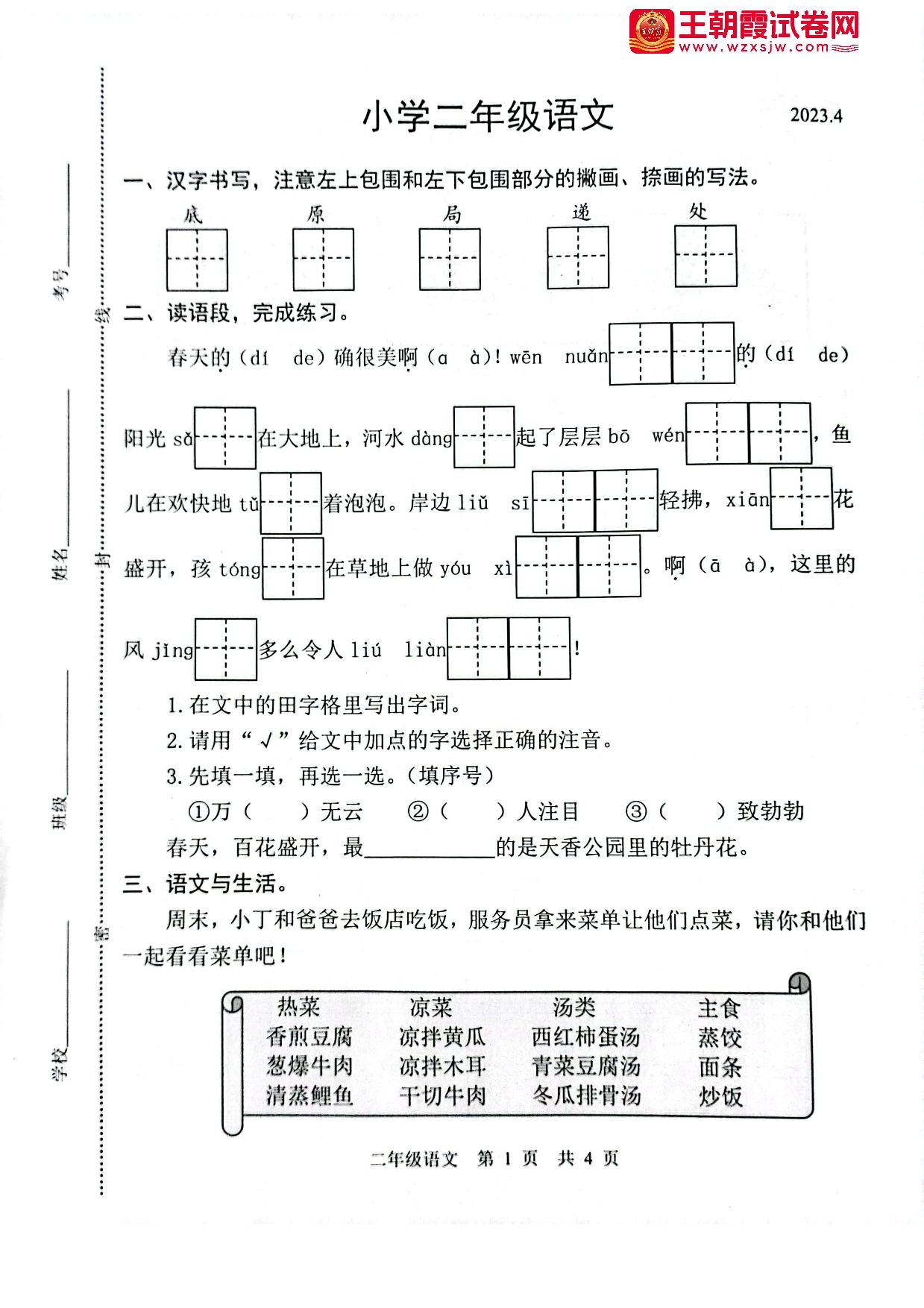 山东省菏泽市牡丹区2022-2023学年下学期4月期中考试二年级语文(人教版)