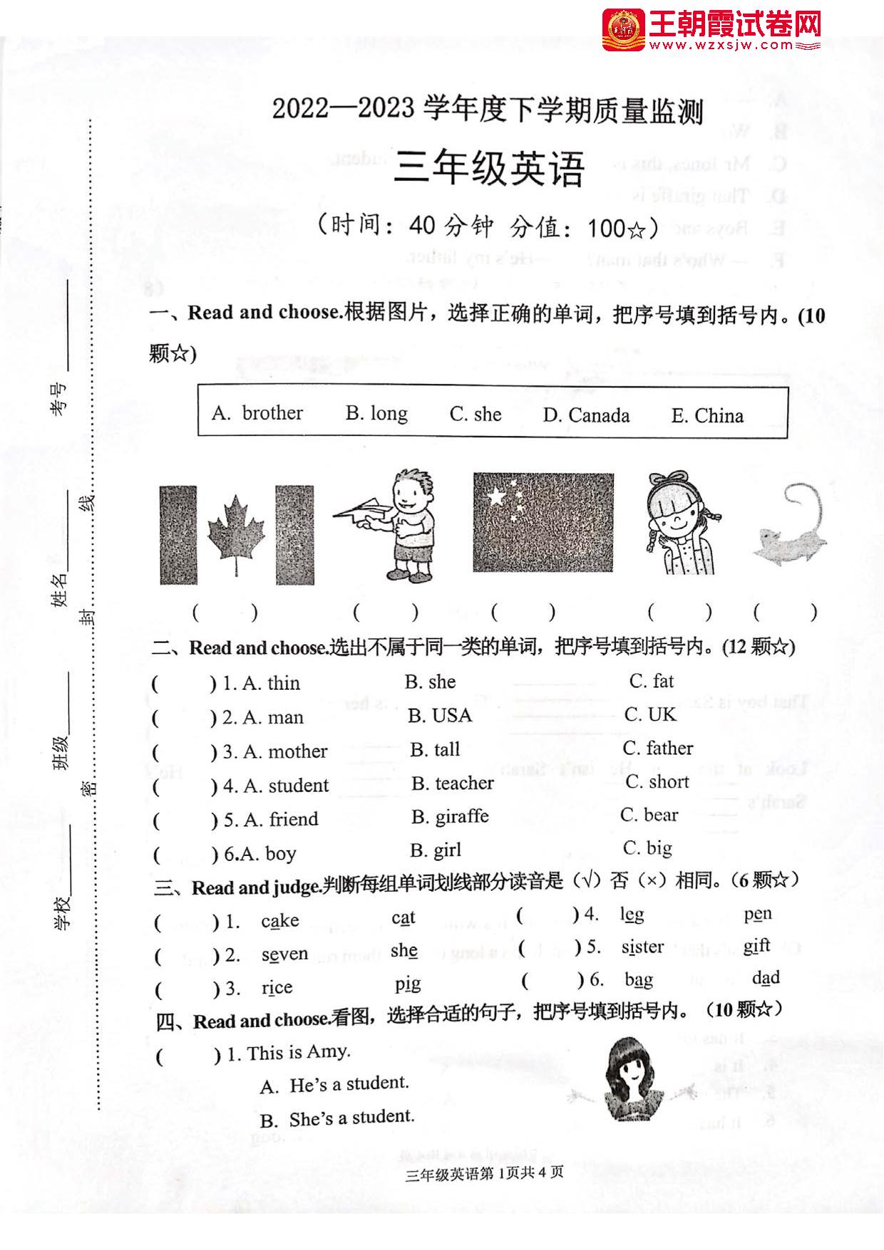 山东省临沂市兰山区2022-2023学年度下学期期中质量监测三年级英语(PEP版)