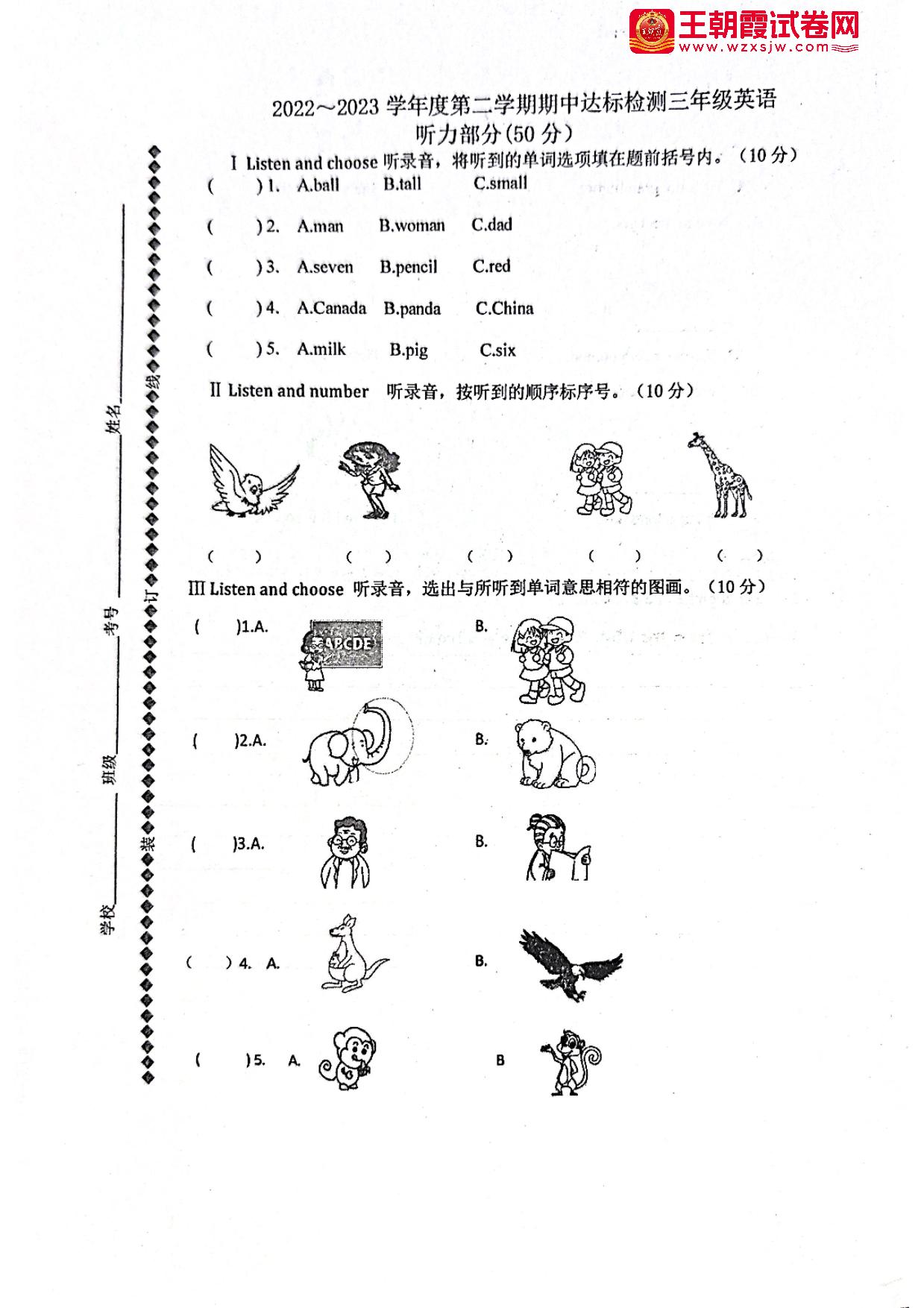 山东省枣庄市市中区2022-2023学年度第二学期期中达标检测三年级英语(PEP版)【无听力音频】