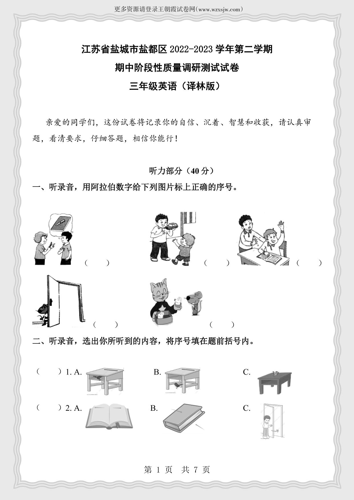 江苏省盐城市盐都区2022-2023学年第二学期期中阶段性质量调研测试试卷三年级英语(译林版)