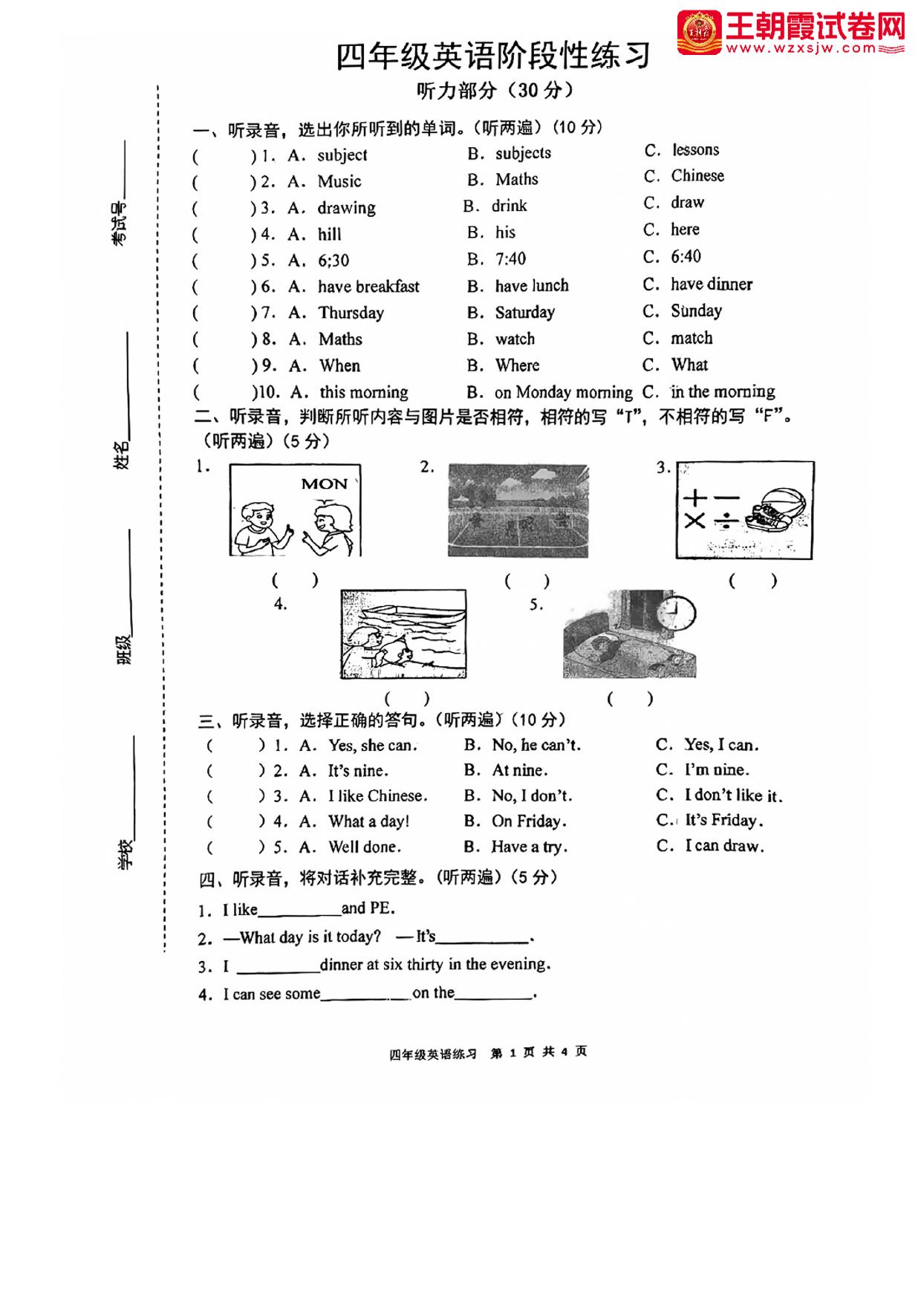 四年级英语译林版(三起始)下册期中卷