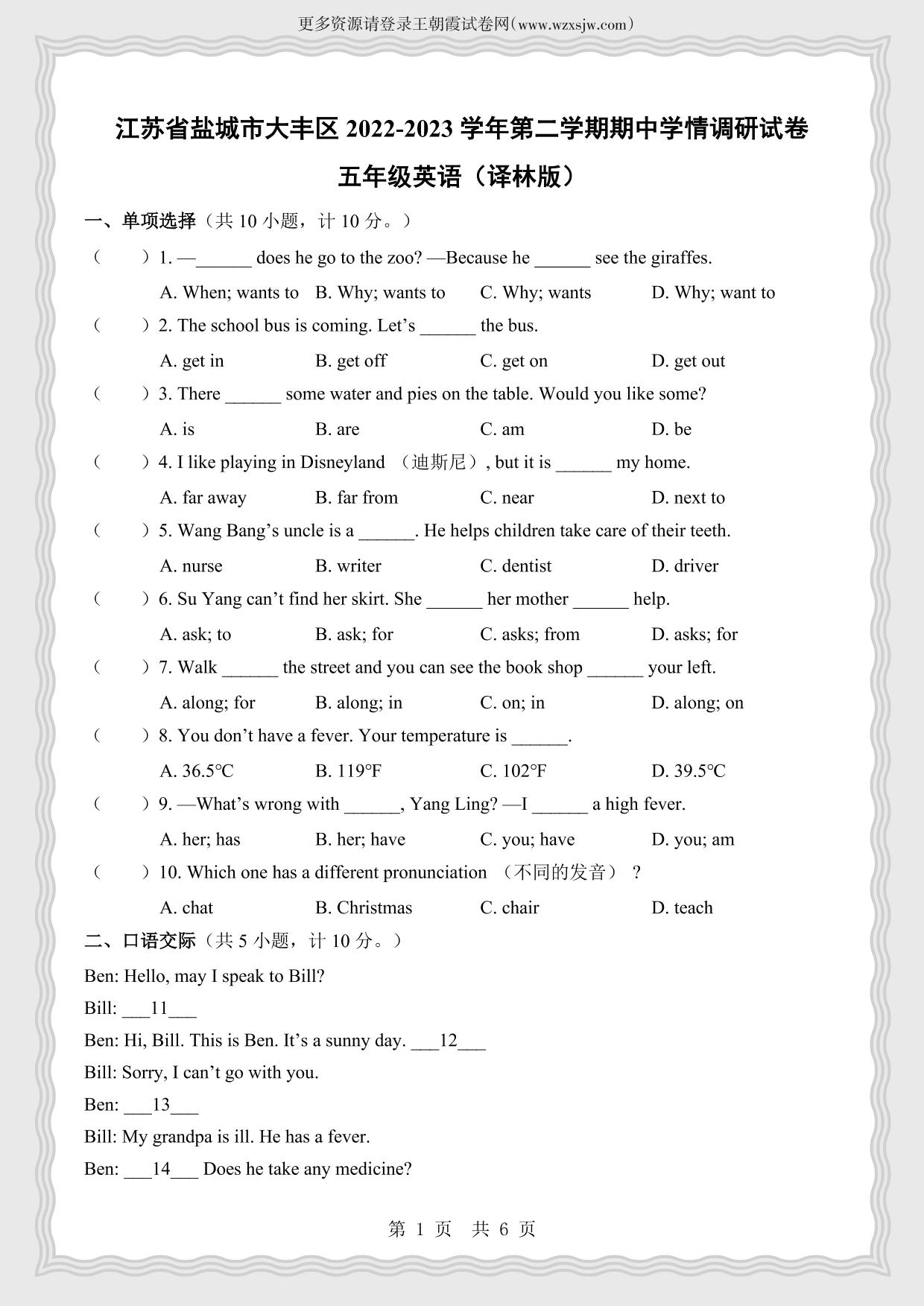 江苏省盐城市大丰区2022-2023学年第二学期期中学情调研试卷五年级英语【无听力音频】(译林版)