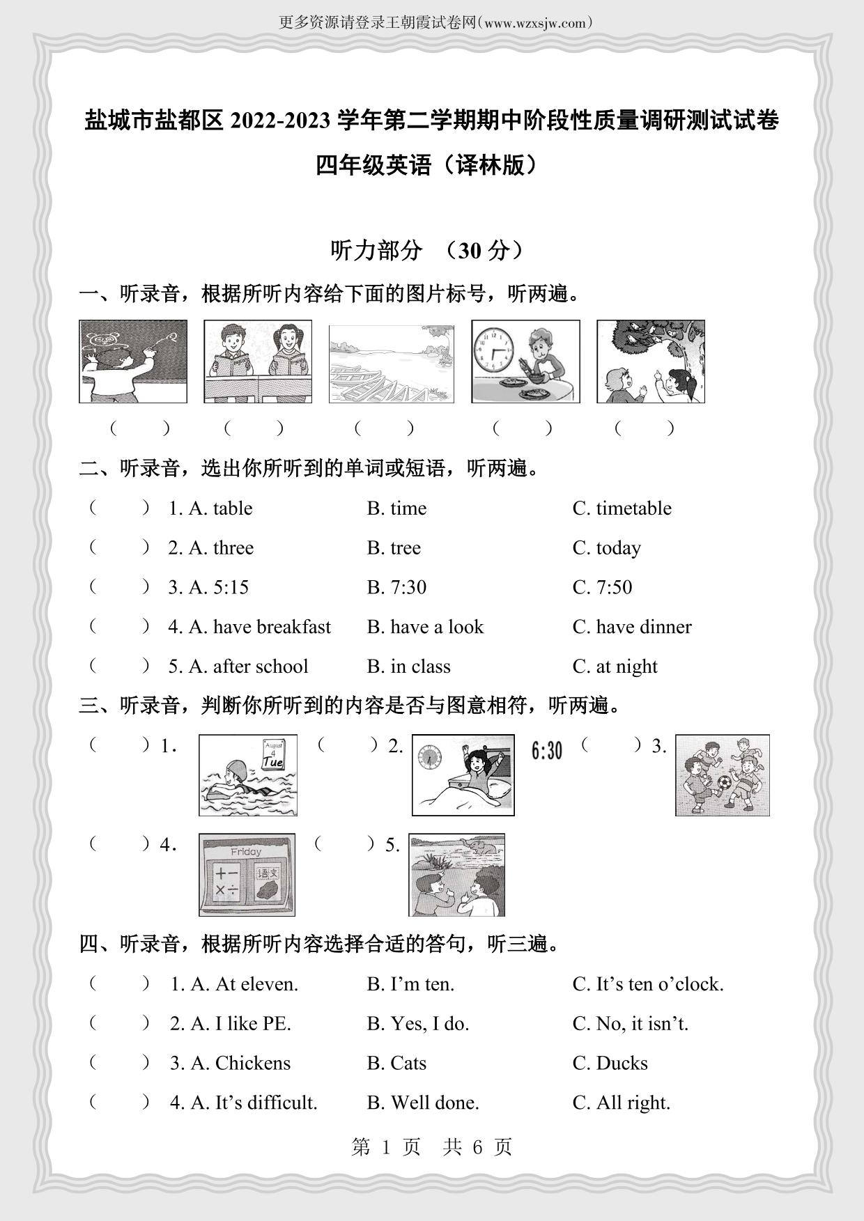 江苏省盐城市盐都区2022-2023学年第二学期期中阶段性质量调研测试试卷四年级英语(译林版)