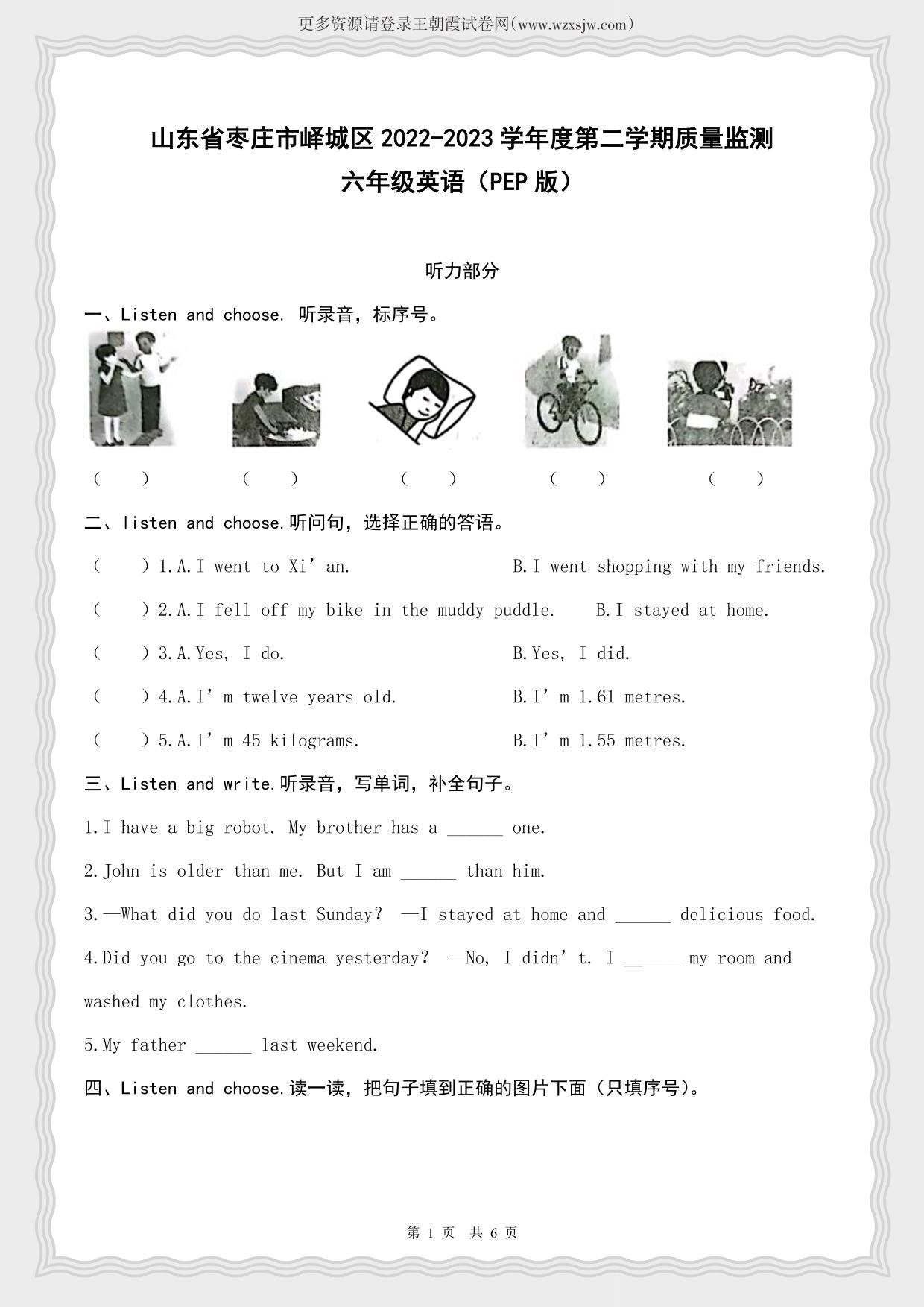 山东省枣庄市峄城区2022-2023学年度第二学期期中质量监测六年级英语(PEP版)