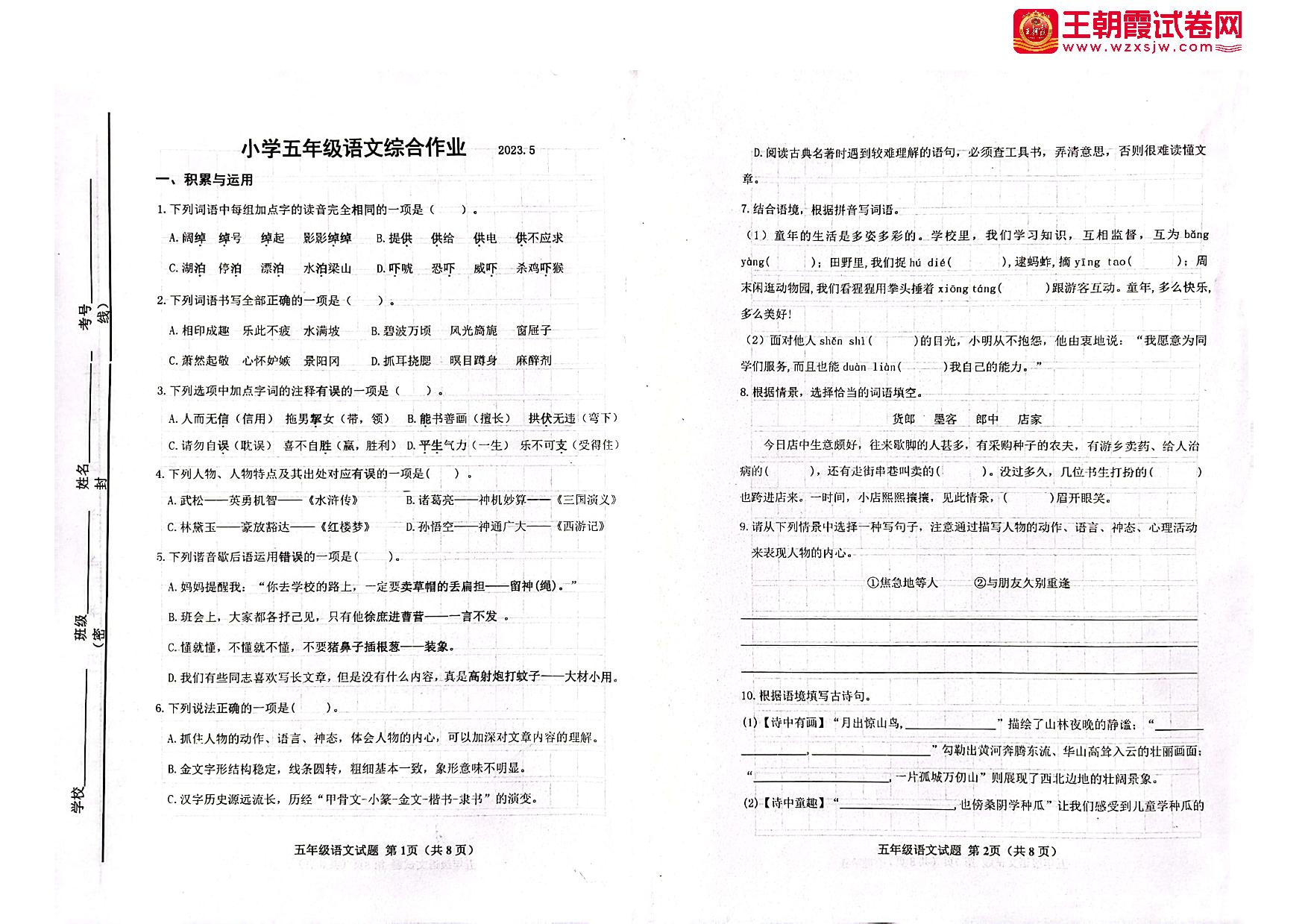 山东省滨州市惠民县2022-2023学年下学期期中学业监测试题五年级语文(人教版)