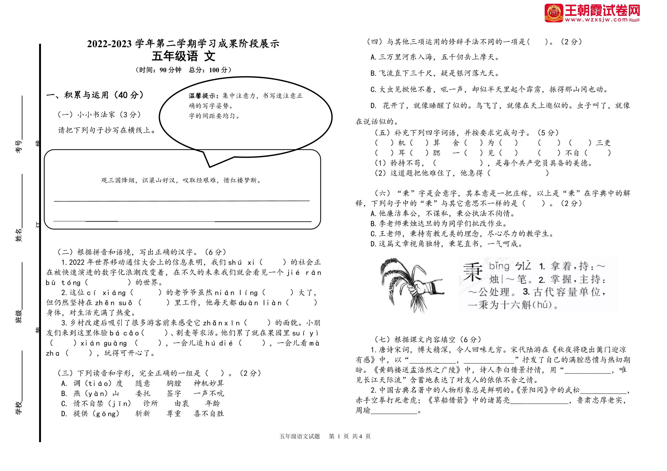 山东省德州市经开区2022-2023学年第二学期(期中)学习成果阶段展示五年级语文(人教版)
