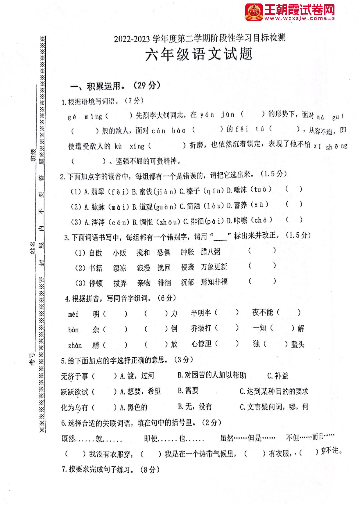 山东省枣庄市市中区2022-2023学年度第二学期(期中)阶段性学习目标检测六年级语文(人教版)