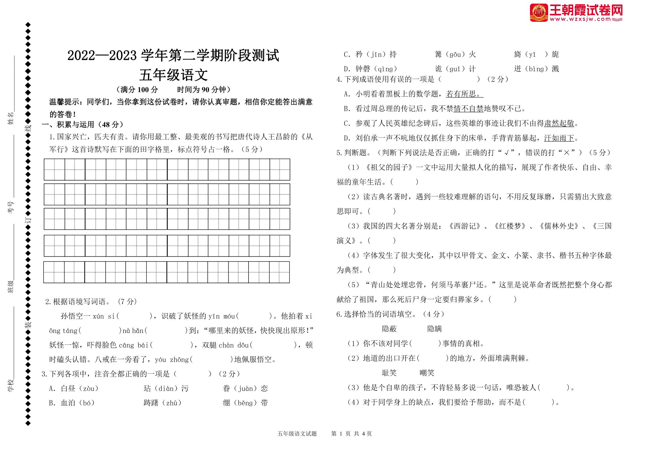 山东省德州市陵城区2022-2023学年第二学期(期中)阶段测试五年级语文(人教版)