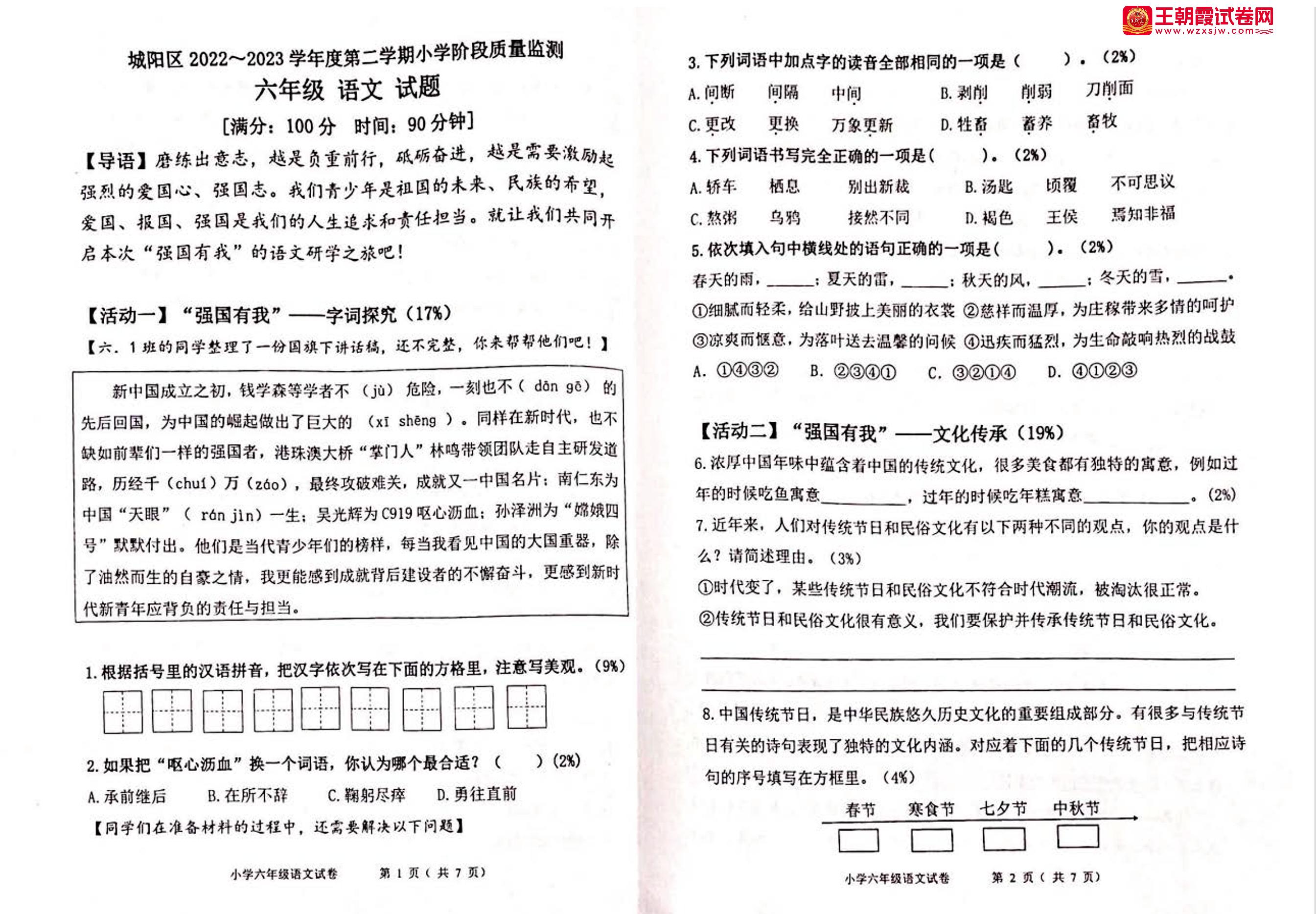 山东省青岛市城阳区2022-2023学年度第二学期(期中)阶段质量监测六年级语文(人教版)