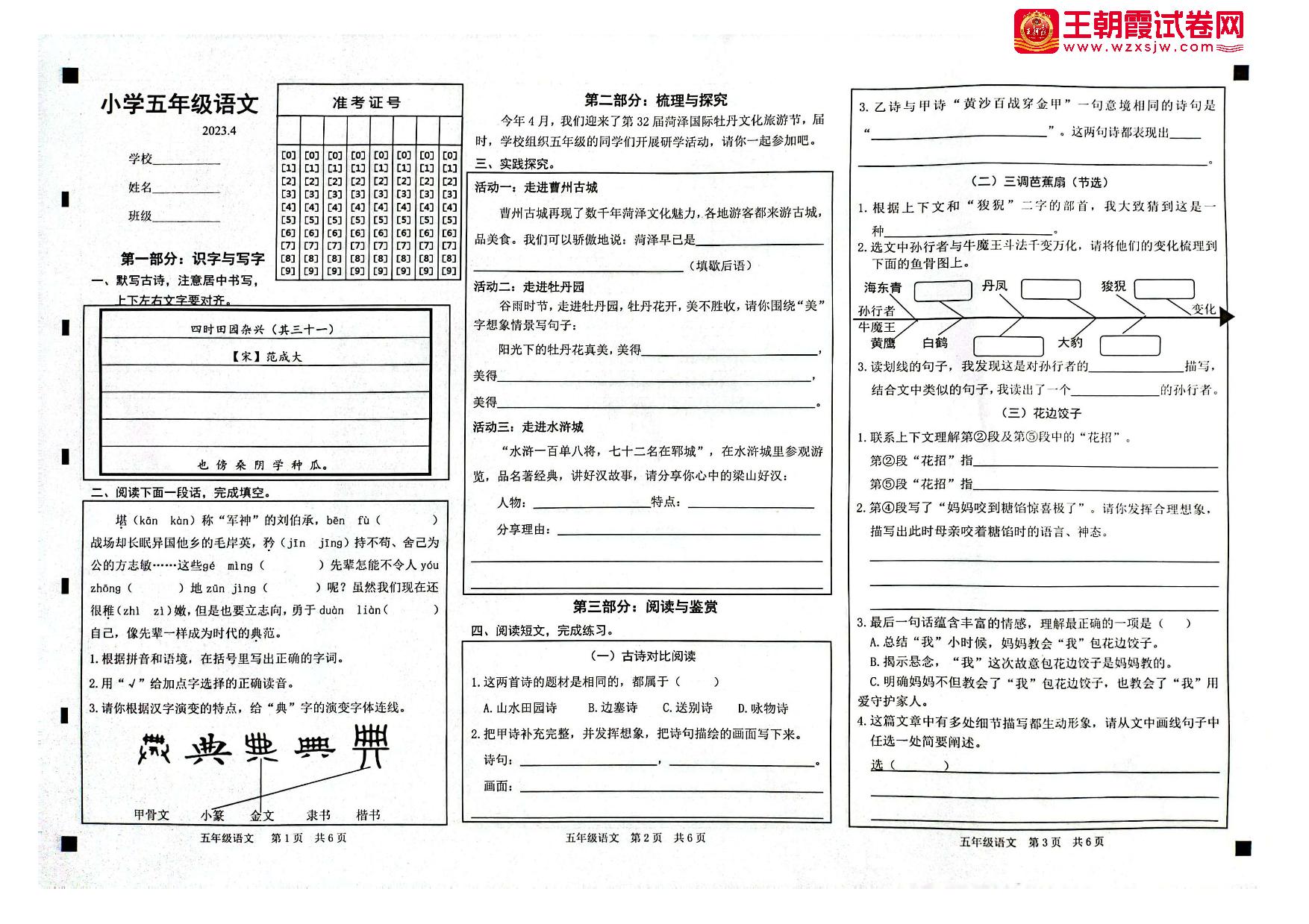 山东省菏泽市牡丹区2022-2023学年下学期4月期中考试五年级语文(人教版)