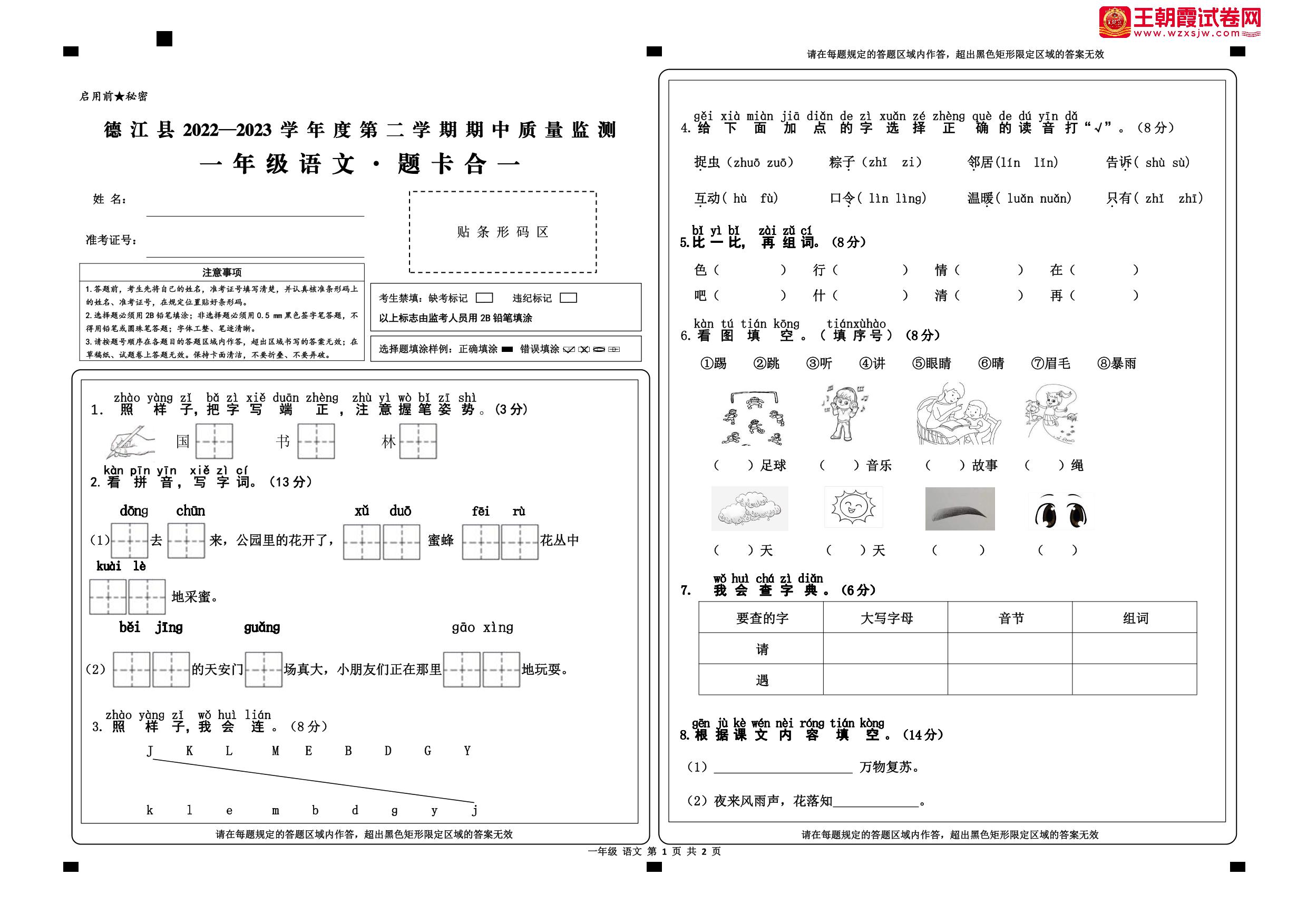贵州省铜仁市德江县2022-2023学年度第二学期中质量监测一年级语文(人教版)
