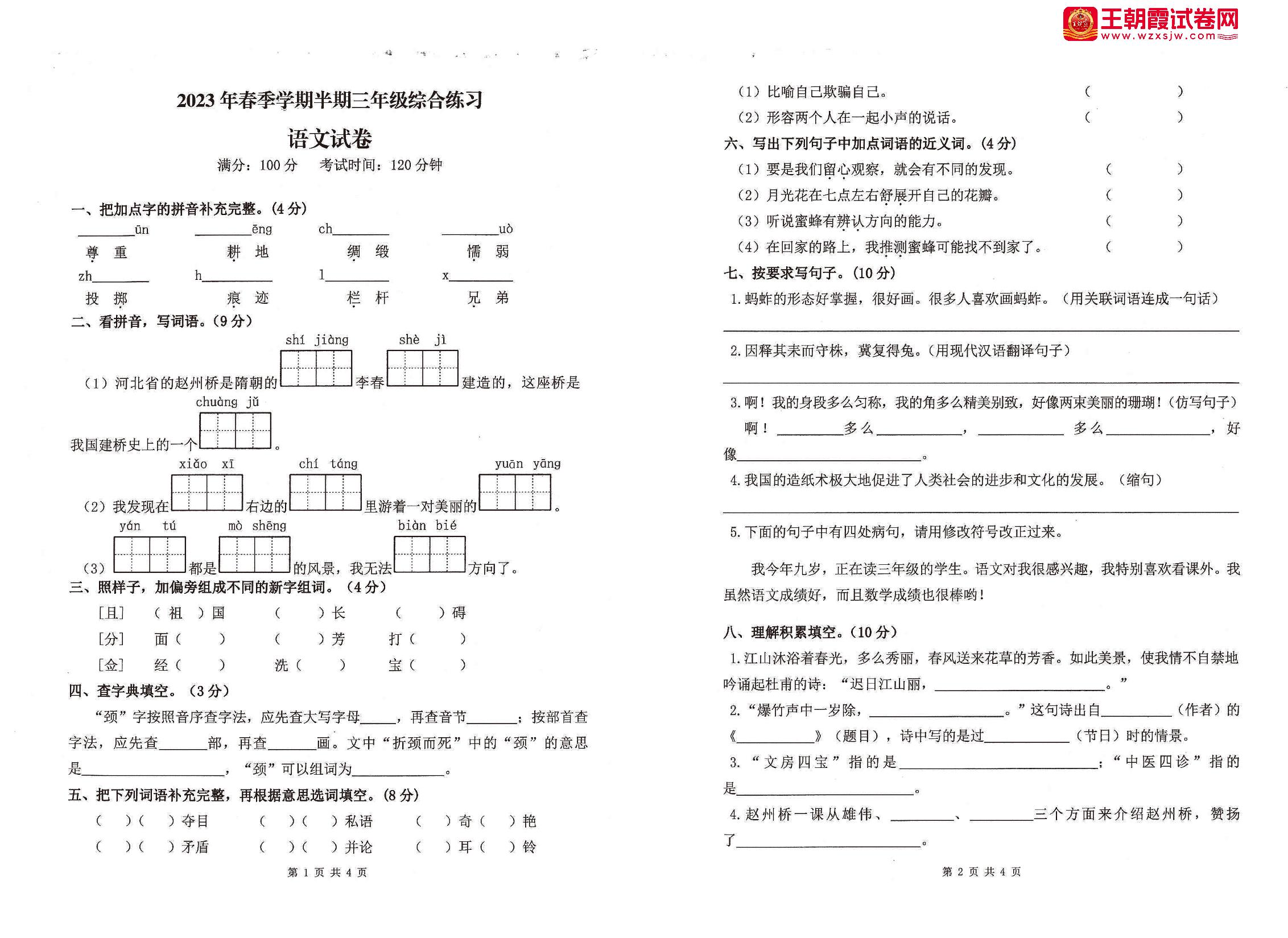 贵州省铜仁市松桃县2022-2023学年下学期期中综合练习三年级语文(人教版)