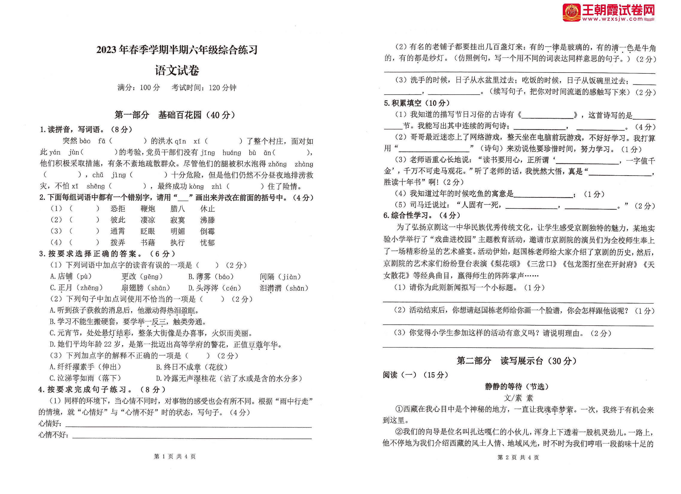六年级语文人教版下册期中卷
