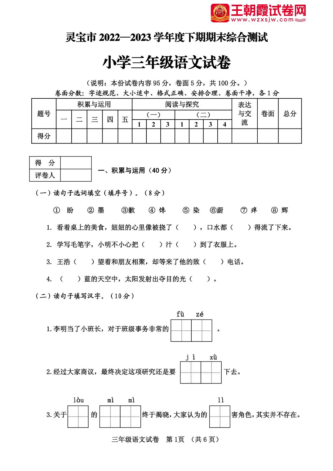 河南省三门峡市灵宝市2022—2023学年下学期期末综合测试三年级语文(人教版)