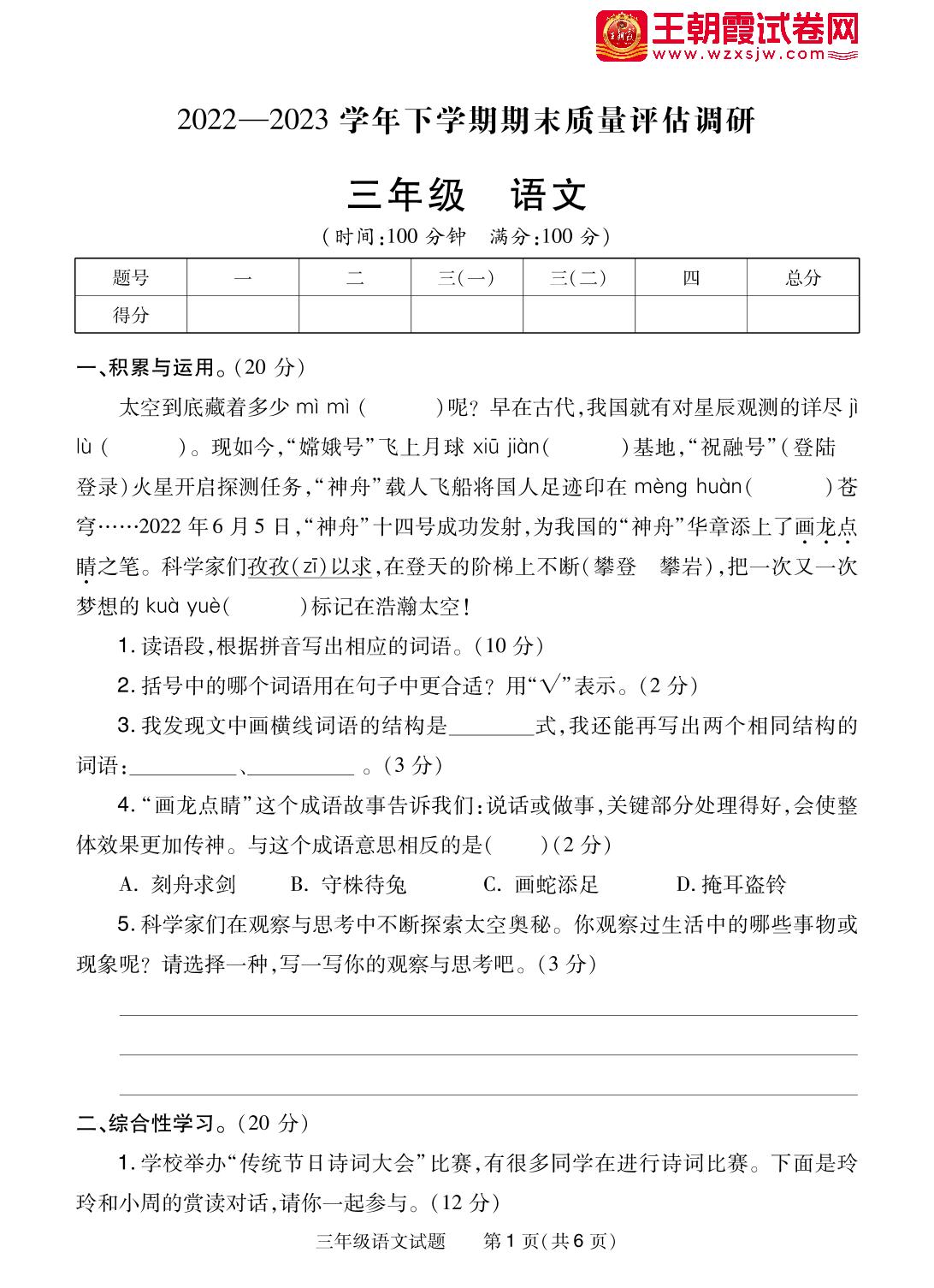 河南省信阳市商城县2022—2023学年下学期期末质量评估调研三年级语文(人教版)
