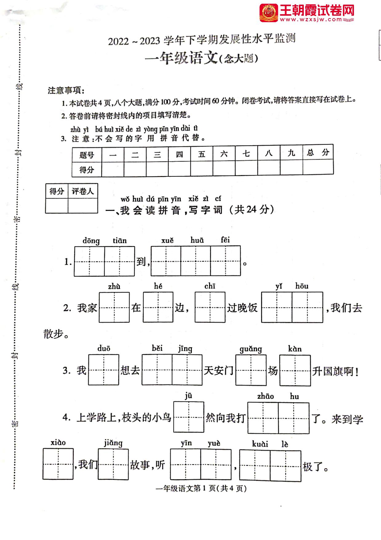 河南省漯河市舞阳县2022—2023学年下学期发展性水平监测试题一年级语文(人教版)_R240415133822857
