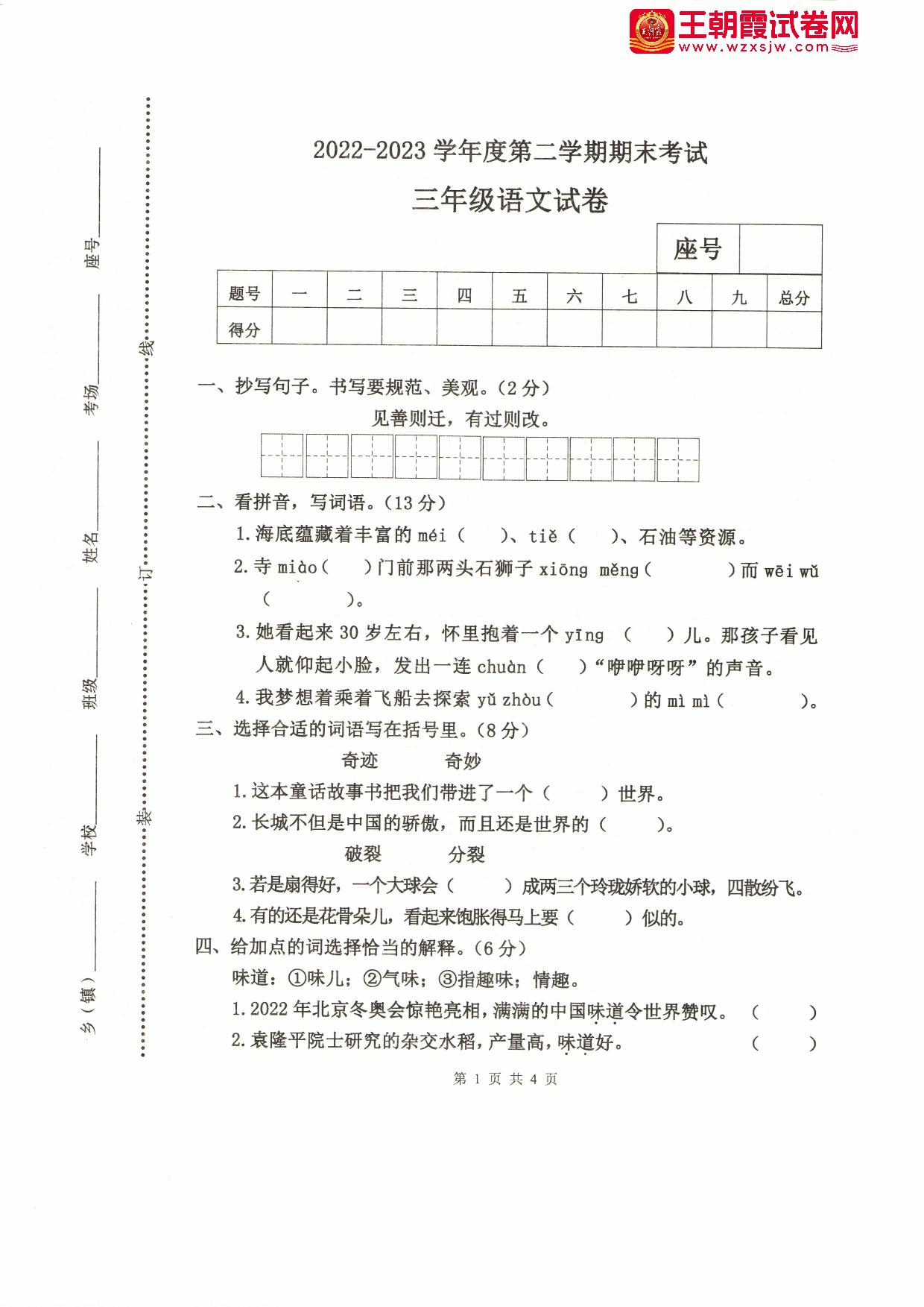 河南省商丘市夏邑县2022—2023学年下学期期末考试三年级语文(人教版)