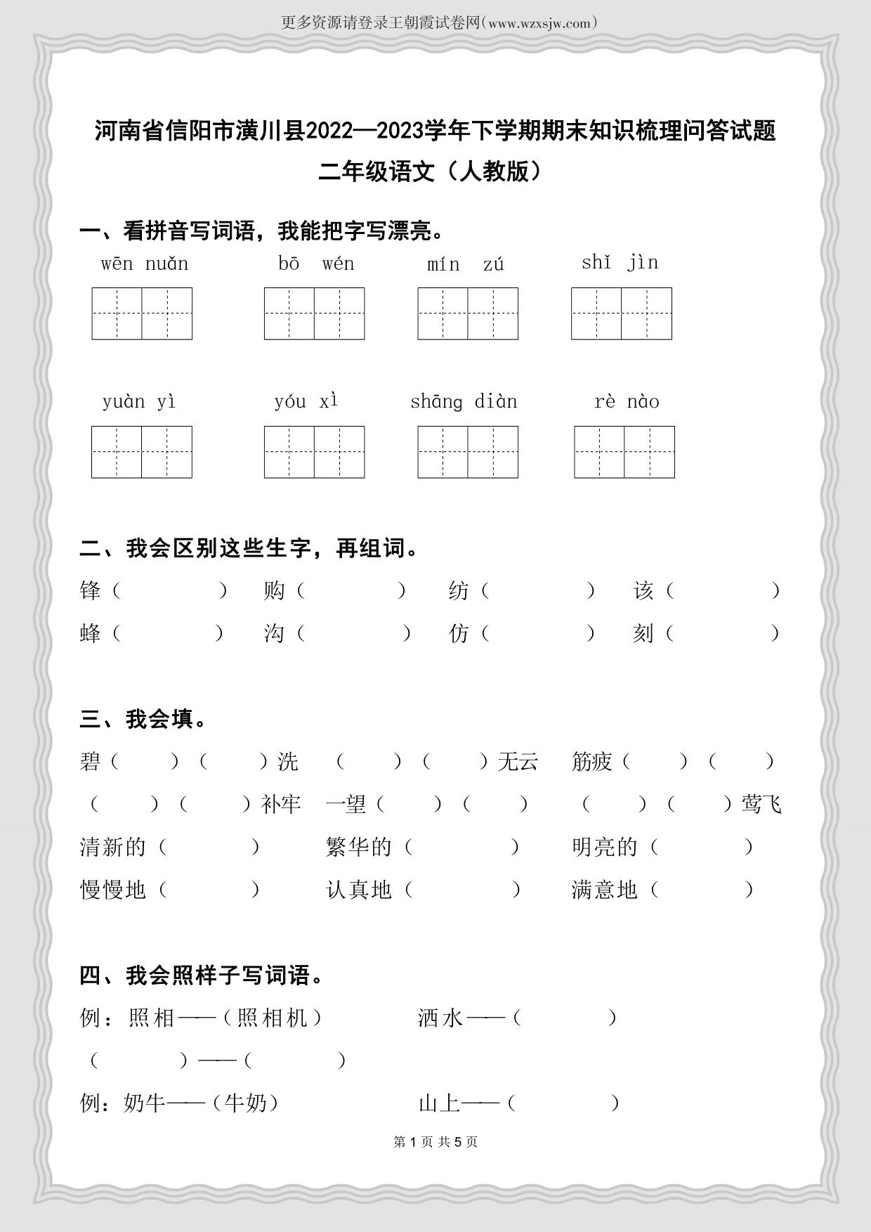 河南省信阳市潢川县2022—2023学年下学期期末知识梳理问答试题二年级语文(人教版)